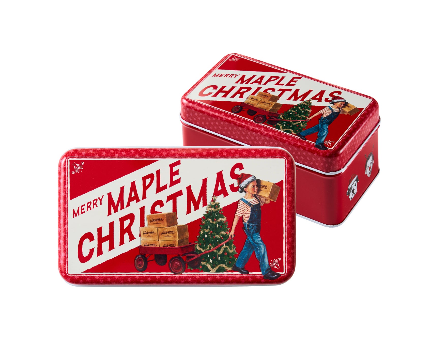 メープル坊やと愛犬のバディがクリスマスを楽しんでいる様子が描かれた限定缶は、クリスマスの贈り物にもピッタリな詰合せになっております。この機会にぜひ求めください。