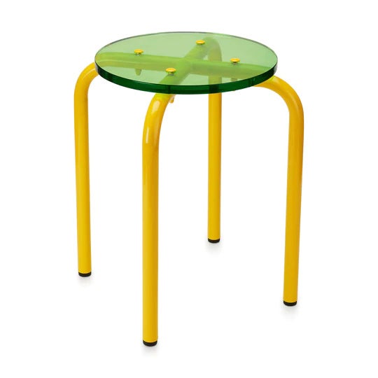 2019年、ローラン・バディエは蚤の市で古い教室の椅子を見つけ、ポップな色と現代的な素材で遊びのある教室の家具を再発明することを思いつきました。鮮やかな色でパウダーコーティングされた4本のスチール脚と、半透明でアクリル製のコントラストカラーの丸い座面で構成されています。
