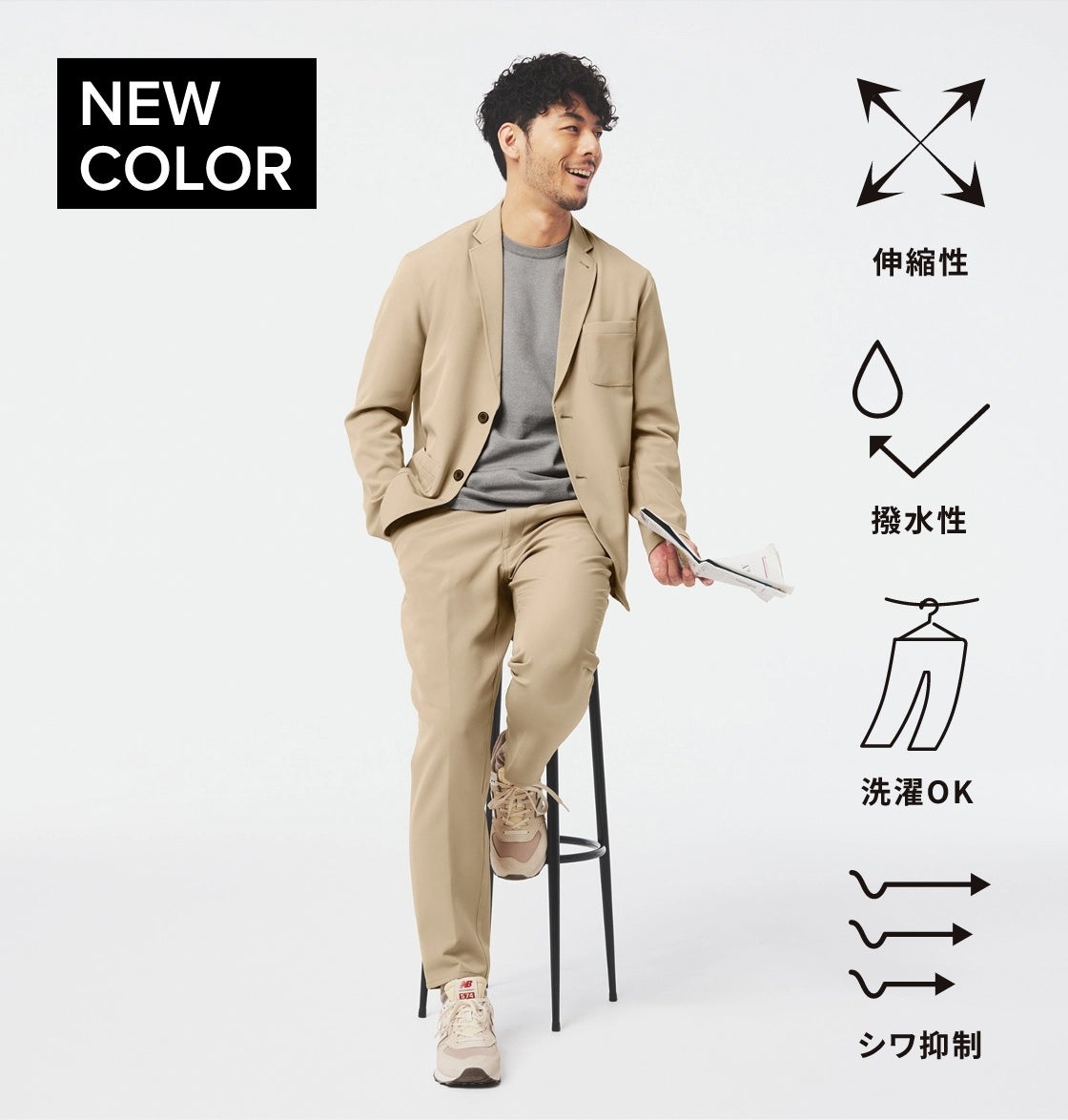 スポーツスペックを搭載した定番セットアップにベージュの新色が登場。シンプルなデザインで、ON でもOFF でも活躍します。