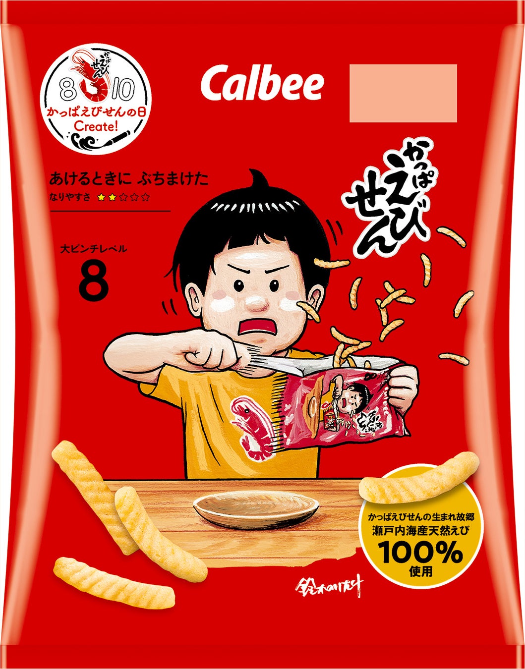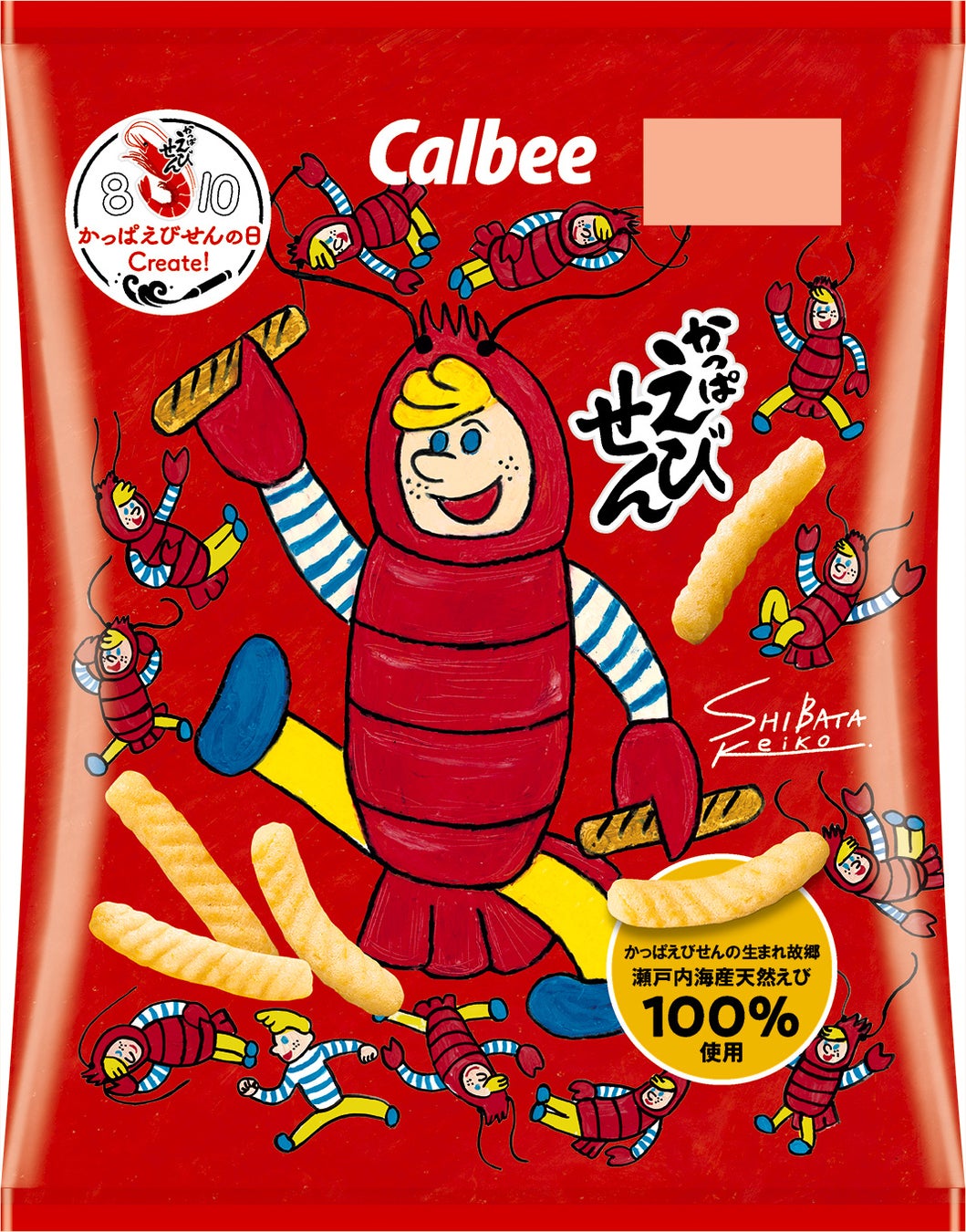 当時小学生の私にかかせないおやつの一つはそう、「かっぱえびせん」50歳になった今ではおつまみとして食べてしまう「かっぱえびせん」そんな親しみのある「かっぱえびせん」のパッケージイラストのご依頼はとても光栄で、喜んで描かせていただきたいとお返事いたしました。