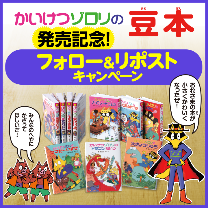 「かいけつゾロリの豆本」の発売を記念して、かいけつゾロリポプラ社公式Xアカウント(@zororizz)にて、公式Xフォロー&リポストキャンペーンを全12回開催いたします!
