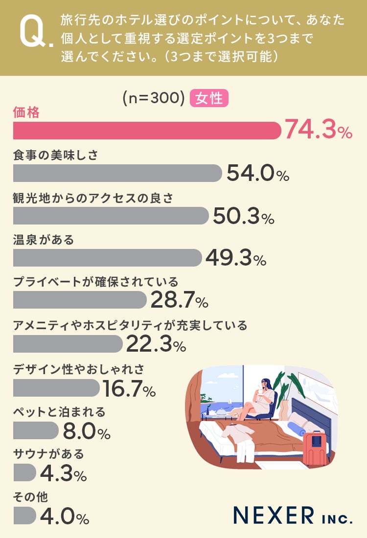 女性の74.3%の方が「価格」を、54%の方が「食事の美味しさ」、そして50.3%の方が「観光地からのアクセスの良さ」を選んでいました。