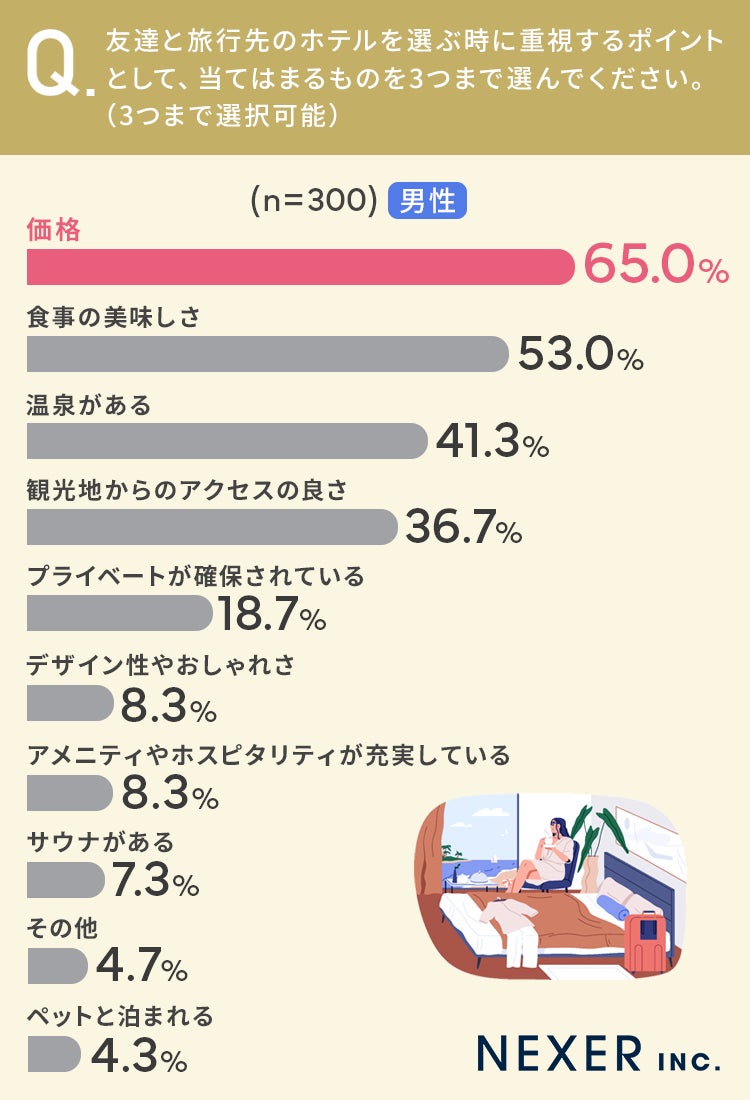 さらに友達との旅行先のホテル選びのポイントについて、男性が重視する選定ポイントを3つまで選んでもらいました。