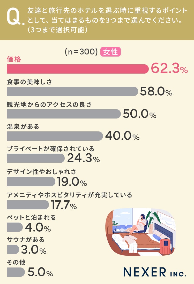 続いて友達との旅行先のホテル選びのポイントについて、女性が重視する選定ポイントを3つまで選んでもらいました。