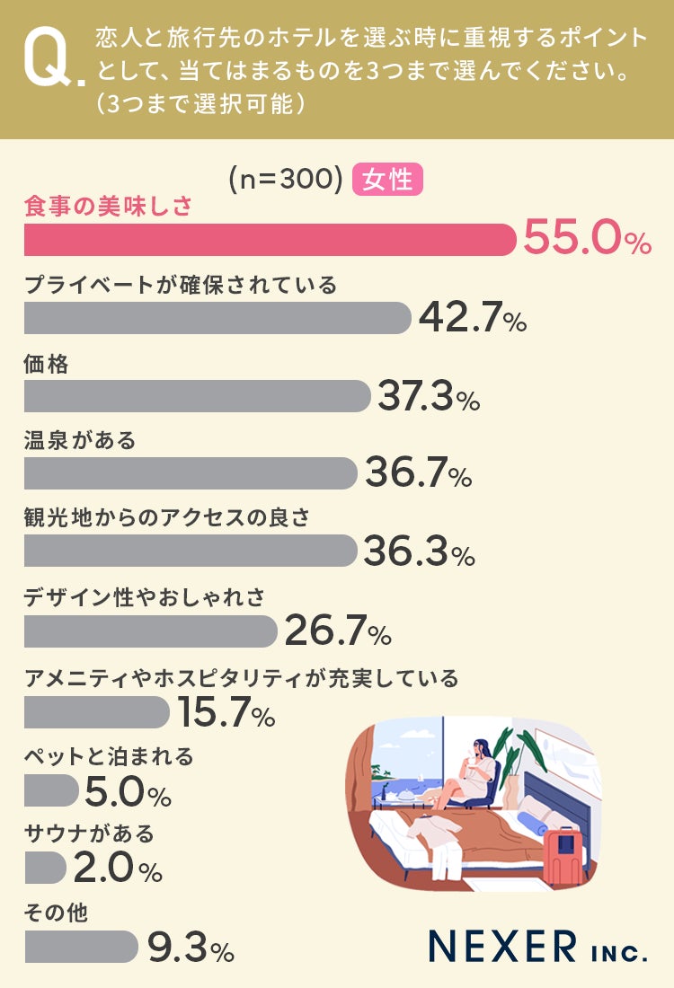 最後に、恋人との旅行先のホテル選びのポイントについて、女性が重視する選定ポイントを3つまで選んでもらいました。