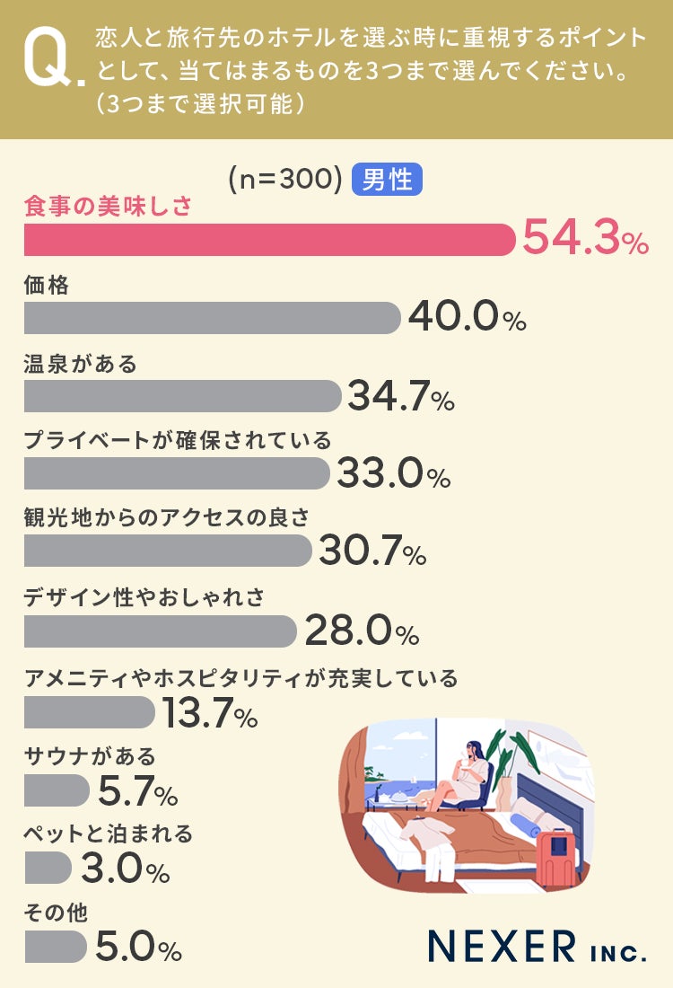 さらに恋人との旅行先のホテル選びのポイントについて、男性が重視する選定ポイントを3つまで選んでもらいました。