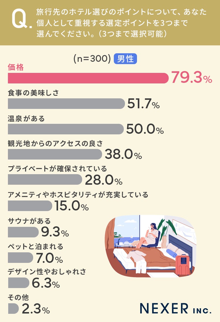 続いて旅行先のホテル選びのポイントについて、男性が個人として重視する選定ポイントを3つまで選んでもらいました。