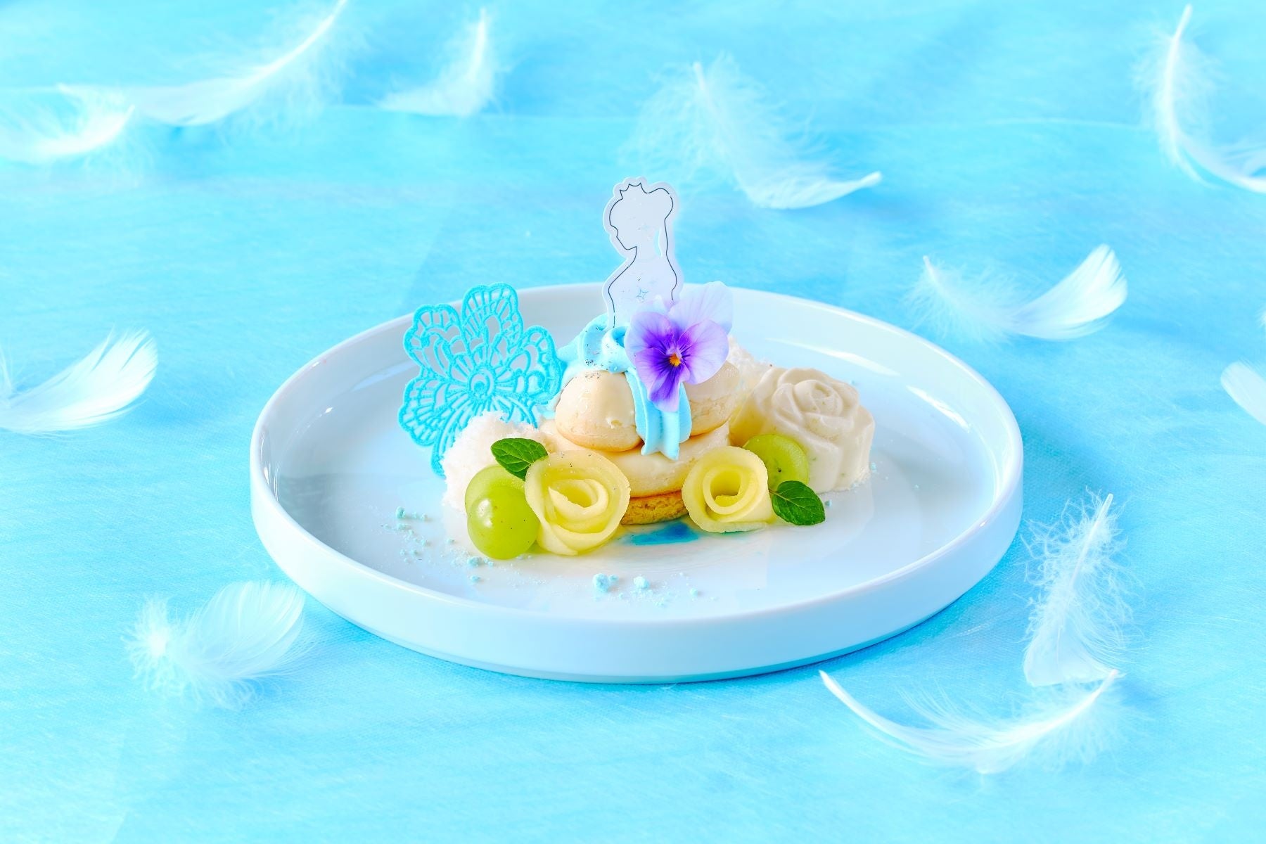 ジューシーな果実味が溢れる日向夏のヴェリーヌや、メロンのヴェールタルト、ホワイトチョコレートの蝶が乗ったつやつや輝くレモンとホワイトチョコのムース、マーブルカラーが可愛らしいバナナのマカロンなど、日向夏・メロン・レモン・バナナの他にも、ライムや梅、ブルーベリーといった清涼感あるフルーツをふんだんに使用し、さっぱりとした味わいに仕上げました。さらに、写真映え間違いなしのハイヒールやプリンセスをイメージしたアイシングクッキーも含めた、パティシエ特製の全7種のスイーツ、3種の軽食をご堪能いただけます。