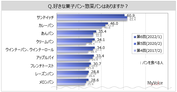 【パンに関する調査】好きな菓子パン・惣菜パンは「サンドイッチ」がパンを食べる人の6割強、「カレーパン」が46%、「あんパン」「クリームパン」「ウインナーパン」「アップルパイ」などが各30%台