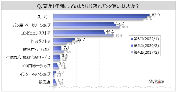 ■1日1回以上パンを食べる人は3割強、高年代層で比率高い。直近1年間にパンを購入した場所は、「スーパー」が8割強、「パン屋・ベーカリーショップ」が5割強、「コンビニエンスストア」が4割強