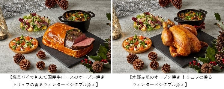 「塩釜パイで包んだ国産牛ロースのオーブン焼き」または「水郷赤鶏のオーブン焼き」の2つのメインディッシュからお好みのお料理をお選びいただき、「スモークサーモン クリームチーズ 法蓮草のキッシュ、フランス産キャビア飾り」、「バイヨンヌの生ハムとコンテチーズのサラダ、蜂蜜レモンドレッシング」、「パネトーネ」をセットでお愉しみいただけるクリスマス限定のテイクアウトメニューです。