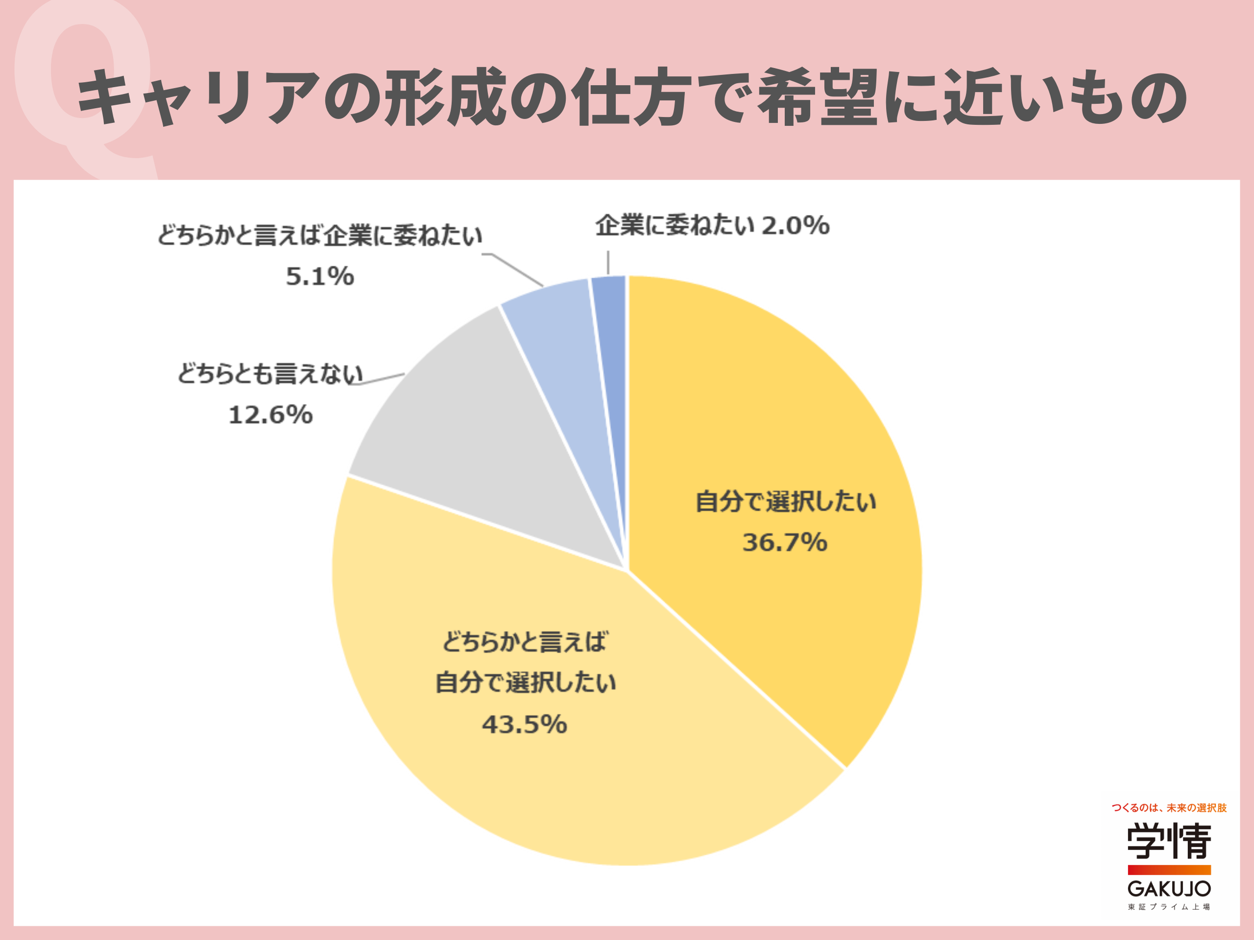 キャリア形成について、「自分で選択したい」と回答した学生が36.7%に上りました。「どちらかと言えば自分で選択したい」43.5%を合わせると、8割以上の学生が「キャリアを自身で形成したい」としています。「キャリアは自分で責任をもって決めたい」「自分で決めたほうが、大変なことがあっても乗り越えられると思う」「上司や先輩とも相談しながら、決めるのは自分自身で決めたい」「ある程度会社からの指示に従うことになると思うが、自身の希望も反映してもらえると嬉しい」といった声が上がりました。