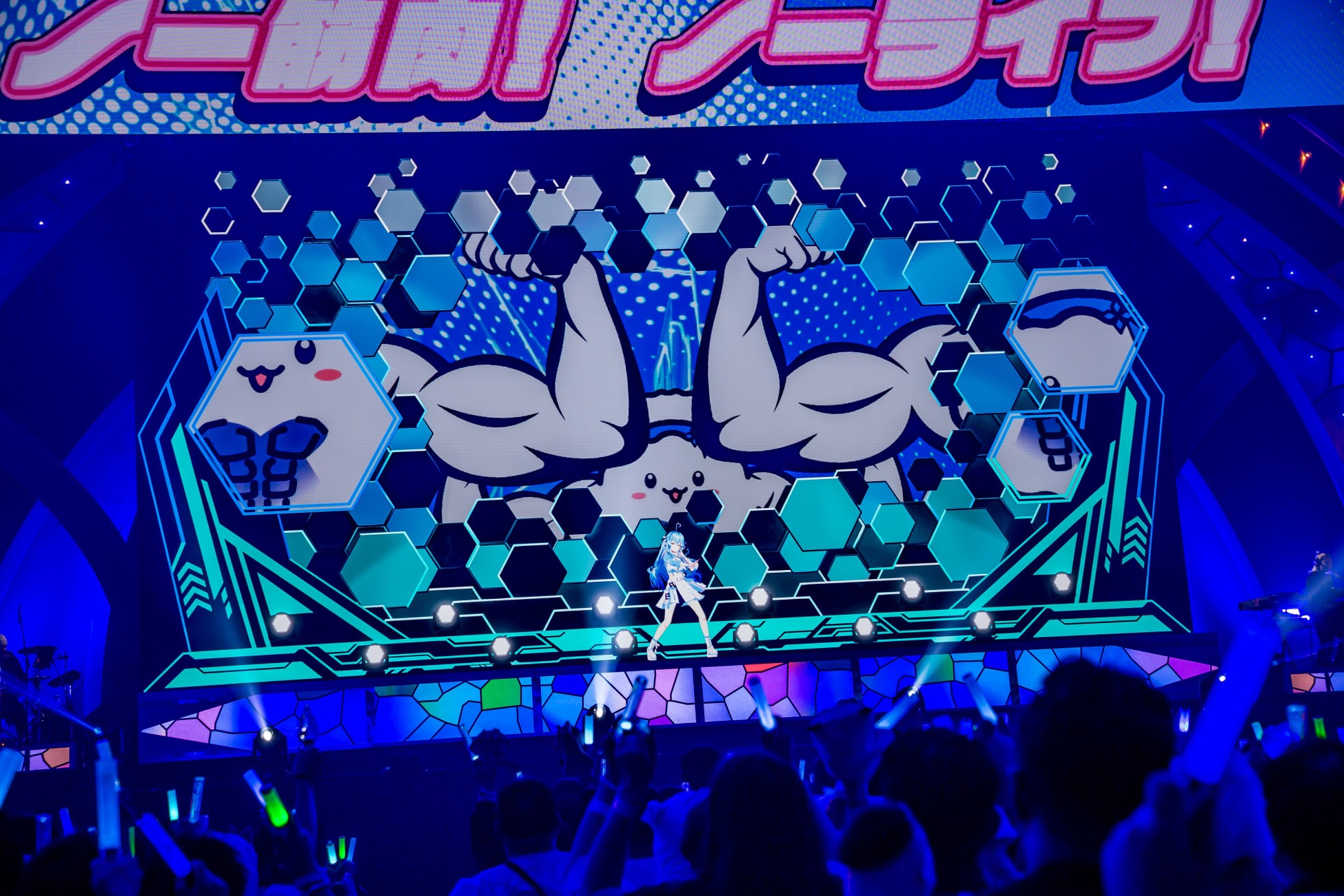以降もホロライブ楽曲の音楽性の幅広さが伝わる楽曲が次々に登場。まろん (IOSYS)が手掛けた桃鈴ねねの「ねねちのギラギラファンミーティング」では、ライブ人気も高い中毒性溢れる楽曲をねね、フワワ・アビスガード&モココ・アビスガードの3人で披露。白銀ノエルの「ぎゅーどんかーにばる!」では彼女と推しを公言する大空スバルとのコラボが実現し、間奏のハードコア系EDMパートなどでも大盛り上がり。一転、ピノキオピーが手掛けた猫又おかゆの「もぐもぐYUMMY!」では、脱力系ポップ曲をソロで歌い上げる。