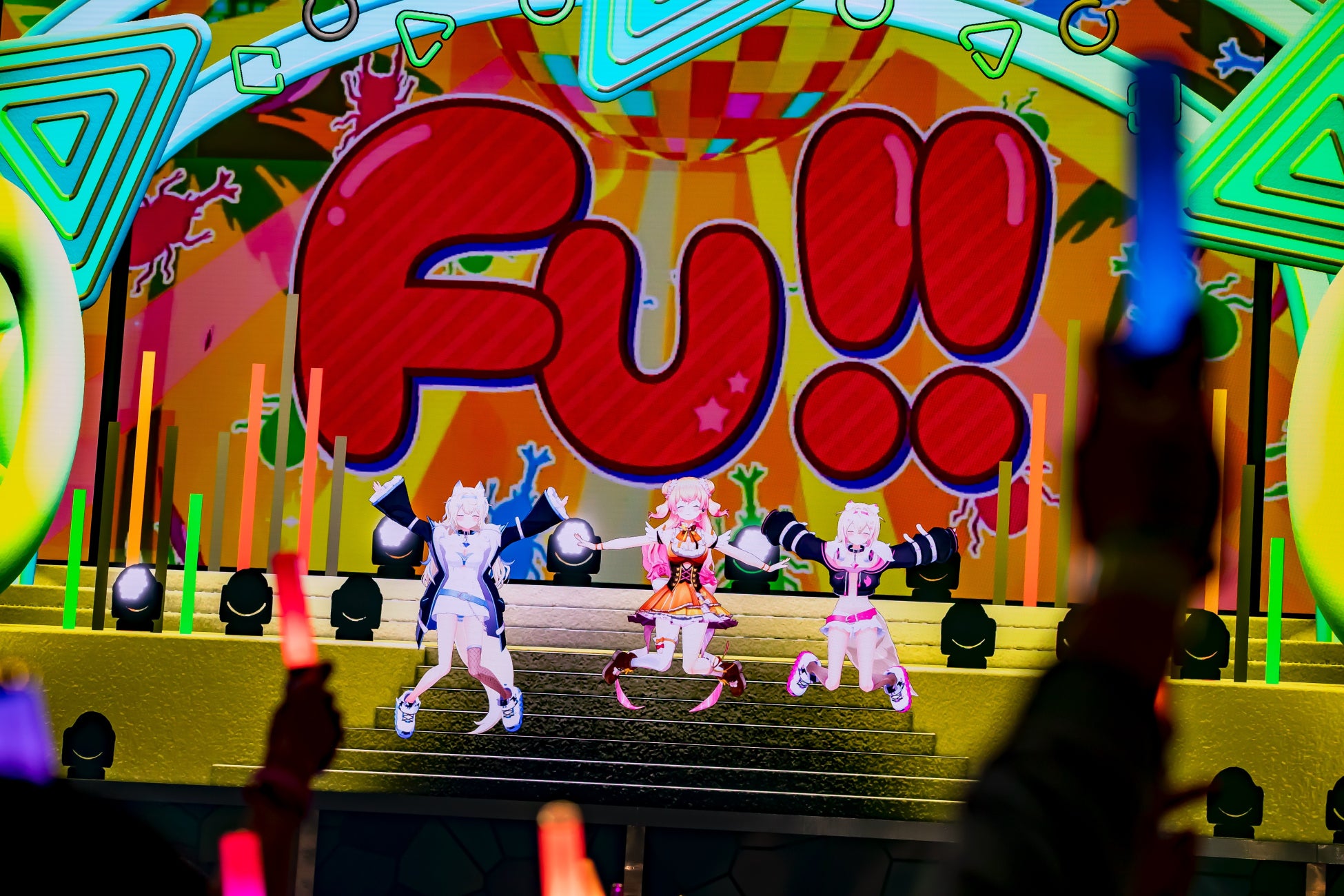 続いて登場したのは白上フブキ、大神ミオ、百鬼あやめによるユニット・いろはにほへっとあやふぶみ。彼女たちは「おにけもだんす」と「百花繚乱花吹雪」をメドレーで披露。息ぴったりのシンクロダンスも加えて和風テイストの楽曲を歌いこなし、「おにけもだんす」の「言いたいことがあるんだ余!」からはじまる3人の要素を詰め込んだ口上などでも観客は大盛り上がり。「百花繚乱花吹雪」ではスモークが会場を覆った。