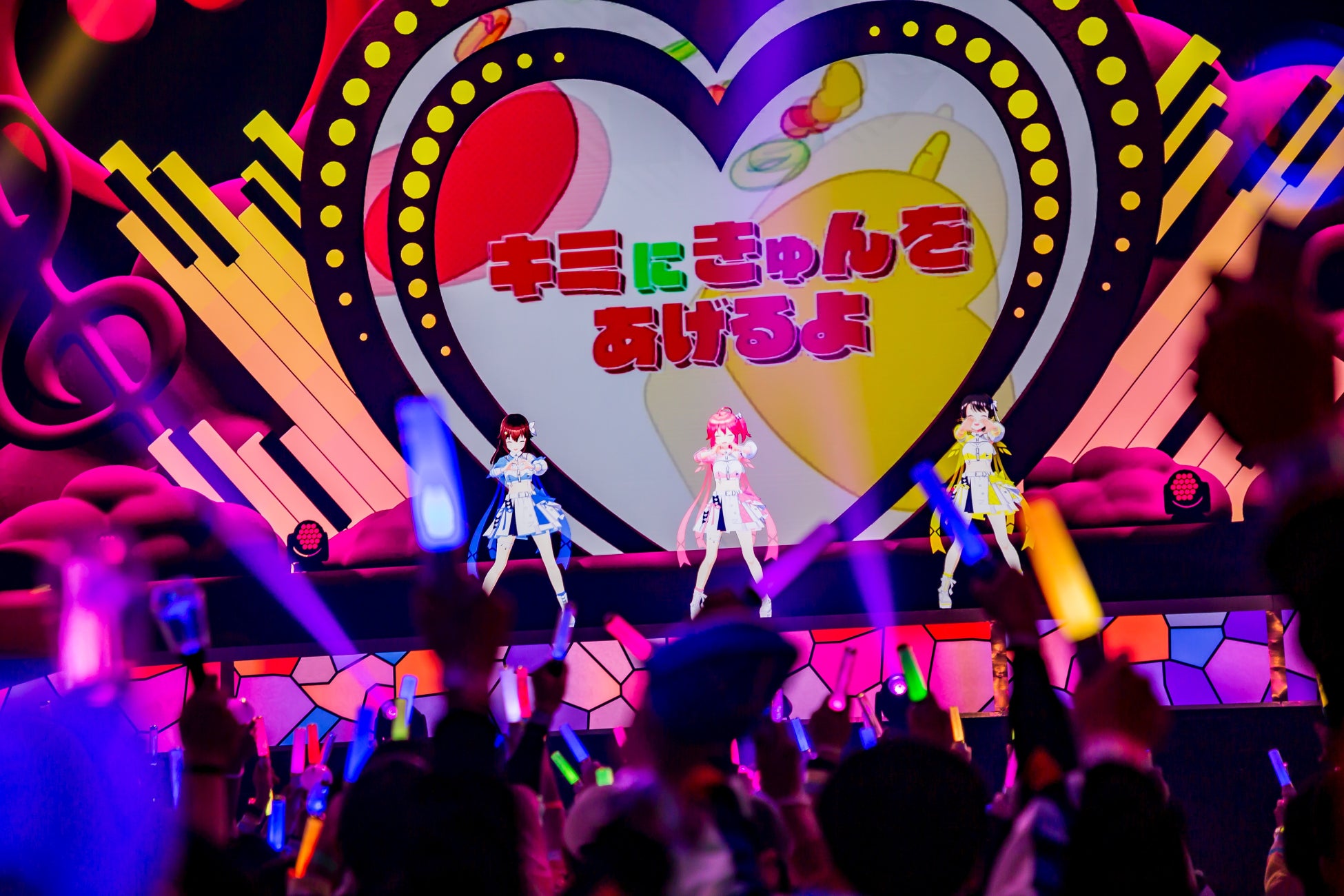ライブ中盤に盛り上がったのはときのそら、さくらみこ、大空スバルがそれぞれの楽曲をともに歌ったコラボメドレー。大空スバルの「ホットダック!」、ときのそらの「スタースタースタート」、さくらみこの「きゅんきゅんみこきゅんきゅん♡」というダンサブルなポップ曲を連発し、観客のコールも受けながら3人らしい賑やかなステージを披露した。