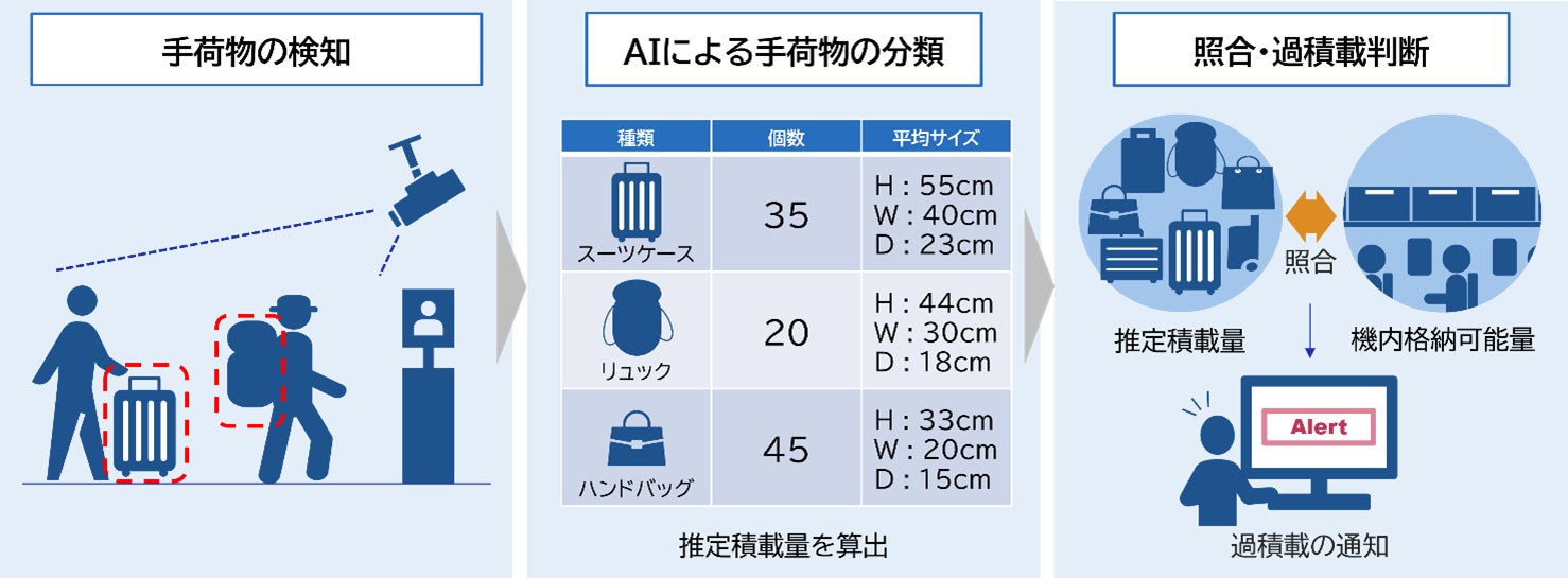 あらかじめ登録された種別に沿って機内持ち込み手荷物を分類し、検出された手荷物が機内の手荷物収納棚を占有するスペースをリアルタイムで推定します。