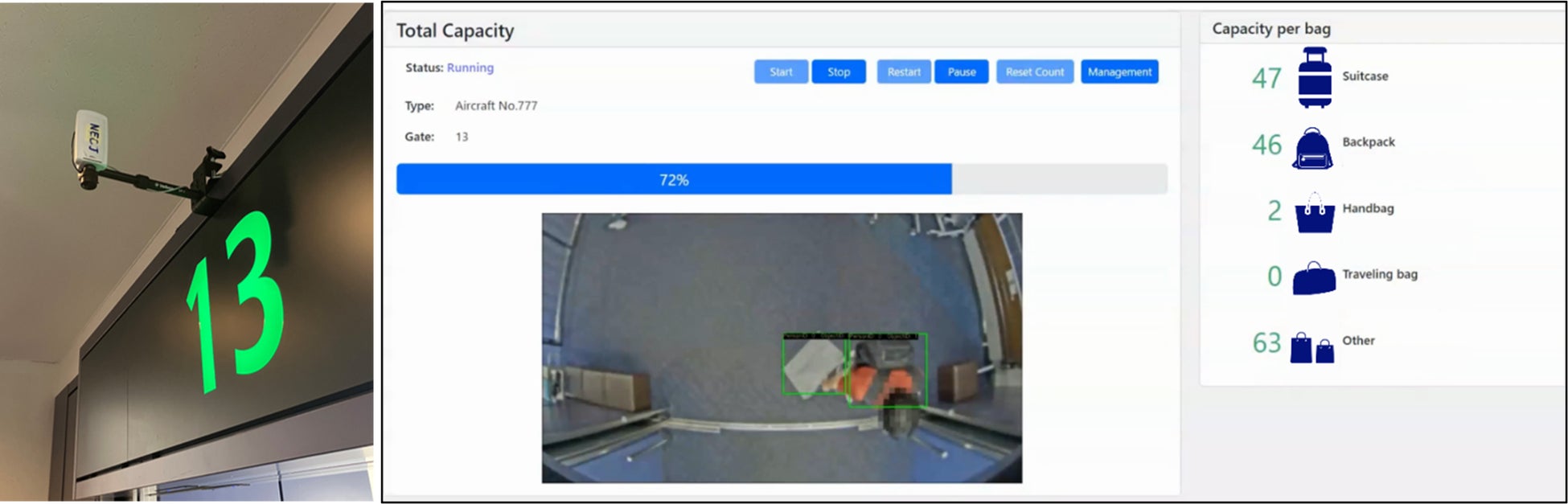 2024年4月~9月の期間中、東京国際空港(羽田)第1ターミナルの13番搭乗口で、本ソリューションを使用した機内持ち込み手荷物の解析精度(検知精度、分類精度)と機内の手荷物収納棚の許容量超過を知らせるアラートタイミングの検証を行いました。その後本ソリューションの有用性を評価しました。
