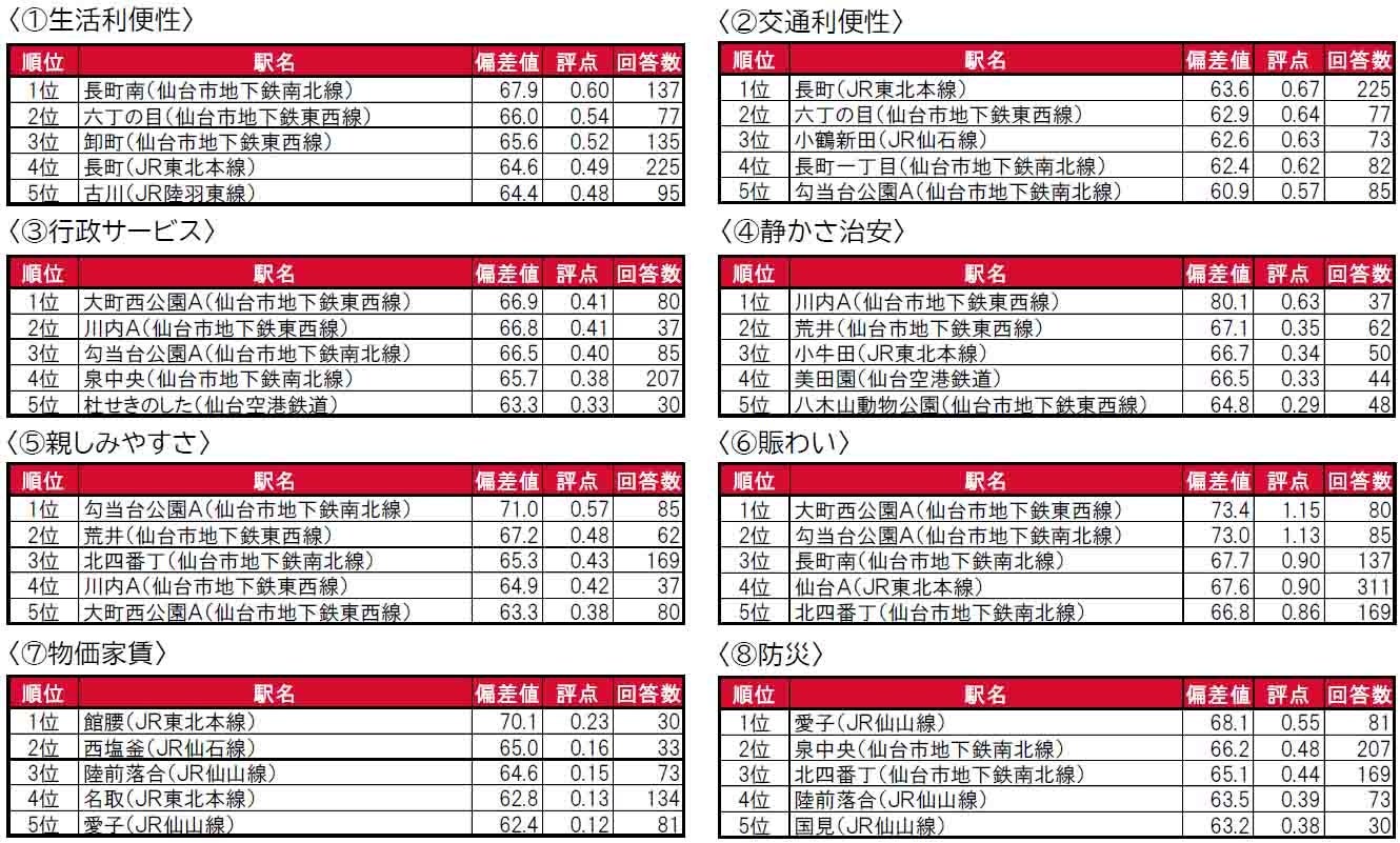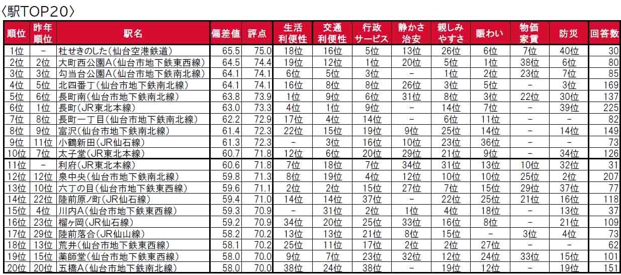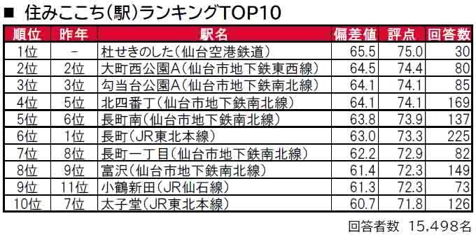 杜せきのした(仙台空港鉄道)が、初登場で1位に輝きました。杜せきのしたは、名取市に位置する駅で、昨年は累計回答者数が30名未満でランキングの集計対象外でした。2位は大町西公園A(大町西公園・青葉通一番町を統合)、3位は勾当台公園A(広瀬通・勾当台公園を統合)で、2年連続でのランクインです。トップ10内では、「住みここち(自治体)」で2位の仙台市太白区に位置する駅(長町南・長町・長町一丁目・富沢・太子堂)や、3位の仙台市青葉区に位置する駅もしくは近隣駅を統合した駅(大町西公園A・勾当台公園A・北四番丁)が多数ランクインしています。