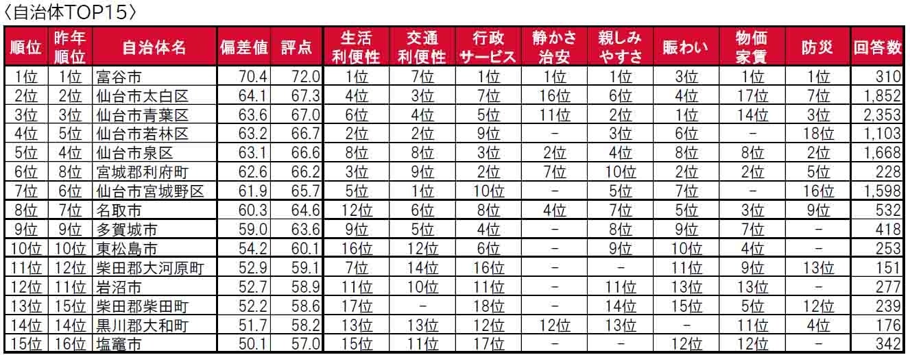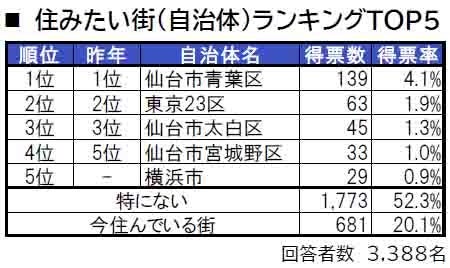 1位は、6年連続で仙台市青葉区です。2位は東京23区、3位は仙台市太白区で、いずれも2年連続でのランクインです。5位には横浜市が新たにランクインしています。