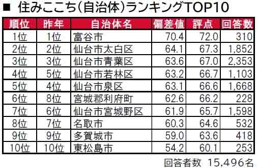 仙台市のベッドタウンである富谷市が唯一偏差値70台の高い評価で、6年連続で1位に輝きました。2位は3年連続で仙台市太白区、3位は2年連続で仙台市青葉区です。トップ5のうち4つは、仙台市の行政区(太白区・青葉区・若林区・泉区)です。