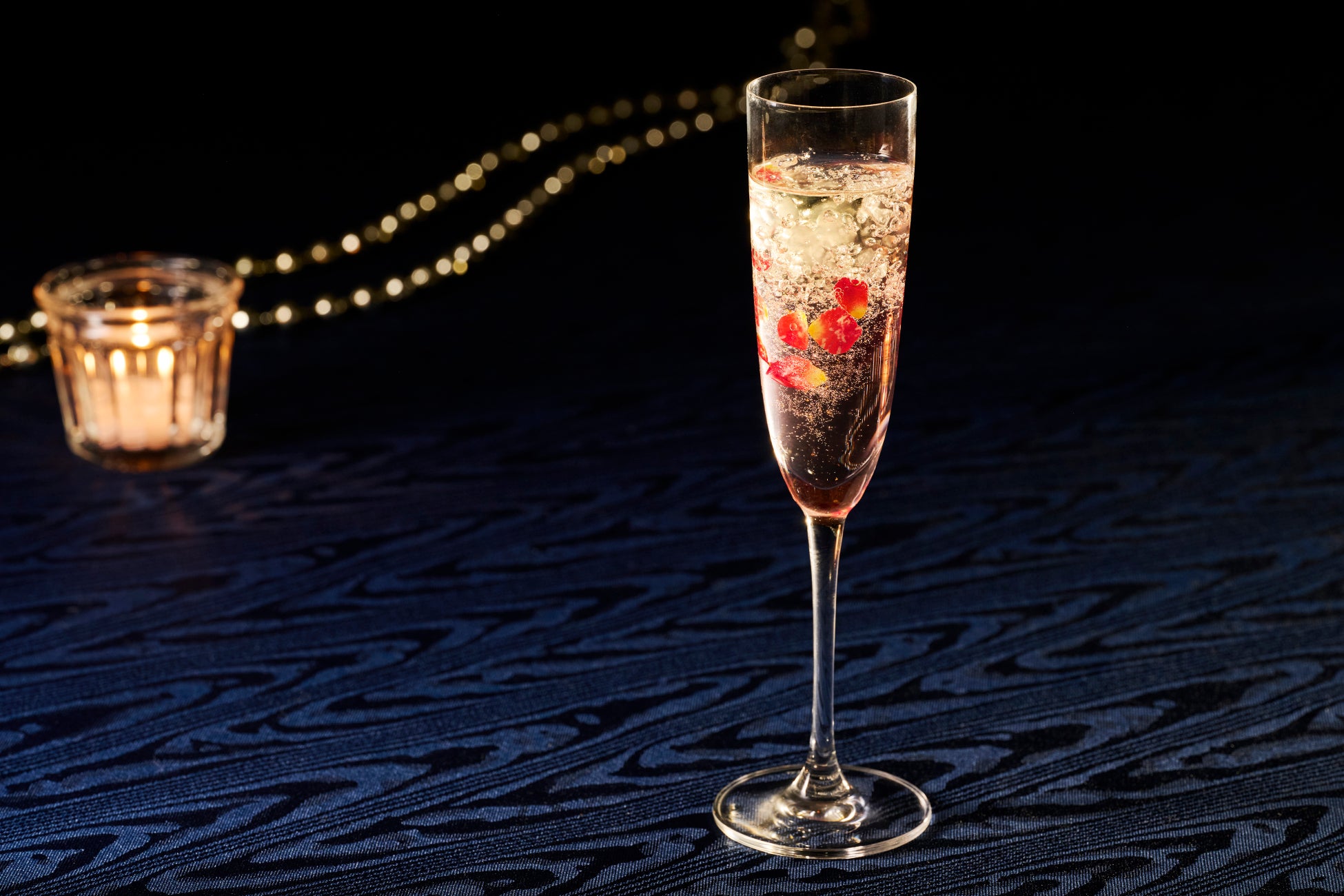 なめらかなジュレをスパークリングワインに重ねた、ほんのりとローズが香るクリスマスカクテルです。