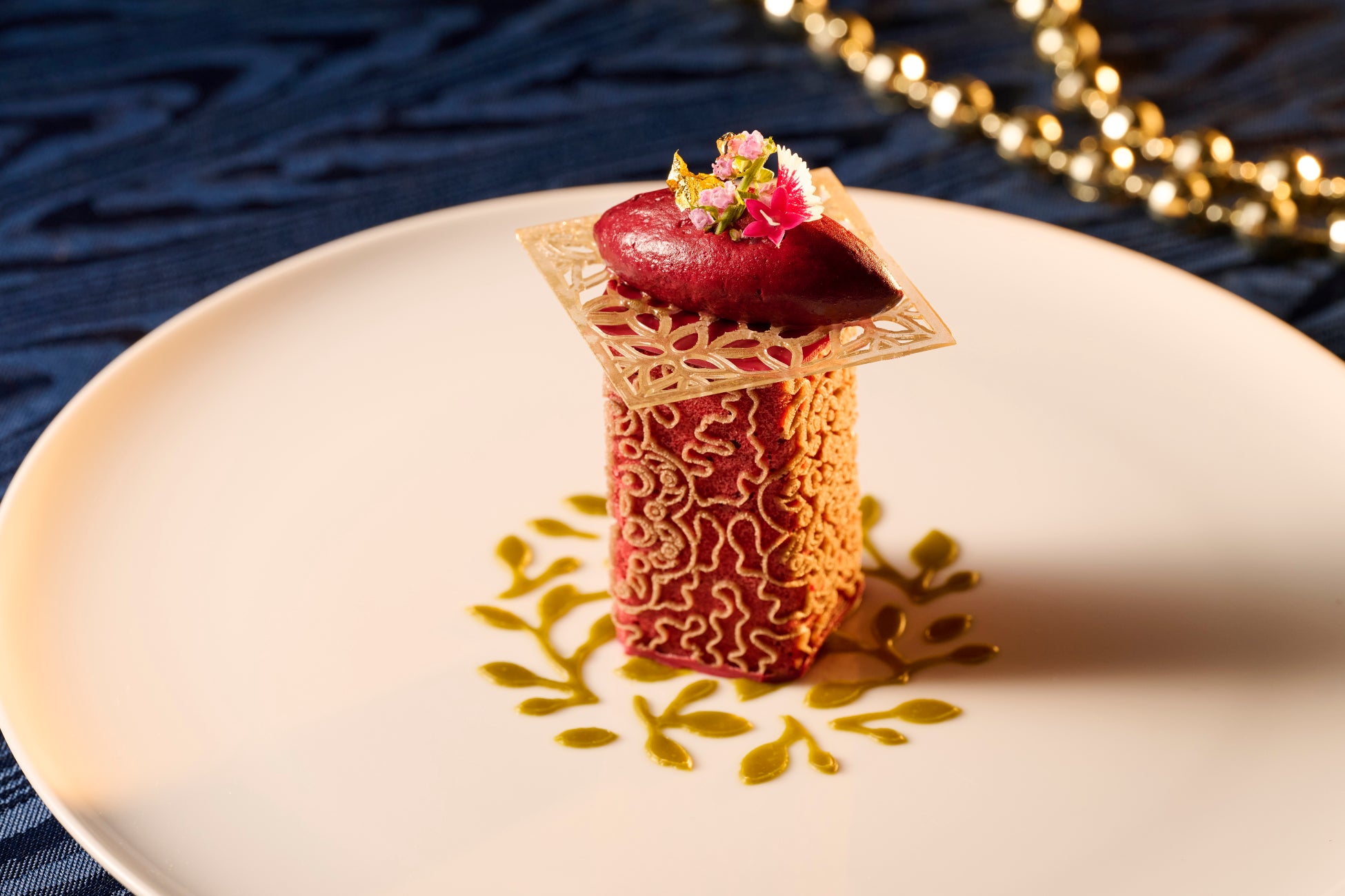 コースのスタートは、鴨とオレンジの組み合わせにほうじ茶の風味をまとわせたアミューズから。パプリカとカニクリームのムースがしっかり重厚感のある味わいのオードブルはタラバガニとキャビアを添えて贅沢に、温前菜のブルーテはポルチーニやトリュフのふくよかな香りと、味わいのグラデーションが楽しめる一品です。魚料理は、オマール海老の濃厚さと北寄貝のうまみを楽しめ、香ばしい焼きリゾットと、丸の内はちみつのヴィネガーを使ったピクルスがアクセントになっています。メインの肉料理にはクラシックに牛フィレ肉のローストとフォアグラのポワレをご用意。赤ワイン風味のクリーム煮にしたポルチーニなど風味や食感、そして彩りをプラスする付け合わせで華やかに仕上げました。苺のほどよい酸味と甘みを楽しめ、見た目にも美しいデセールがコースを締めくくります。