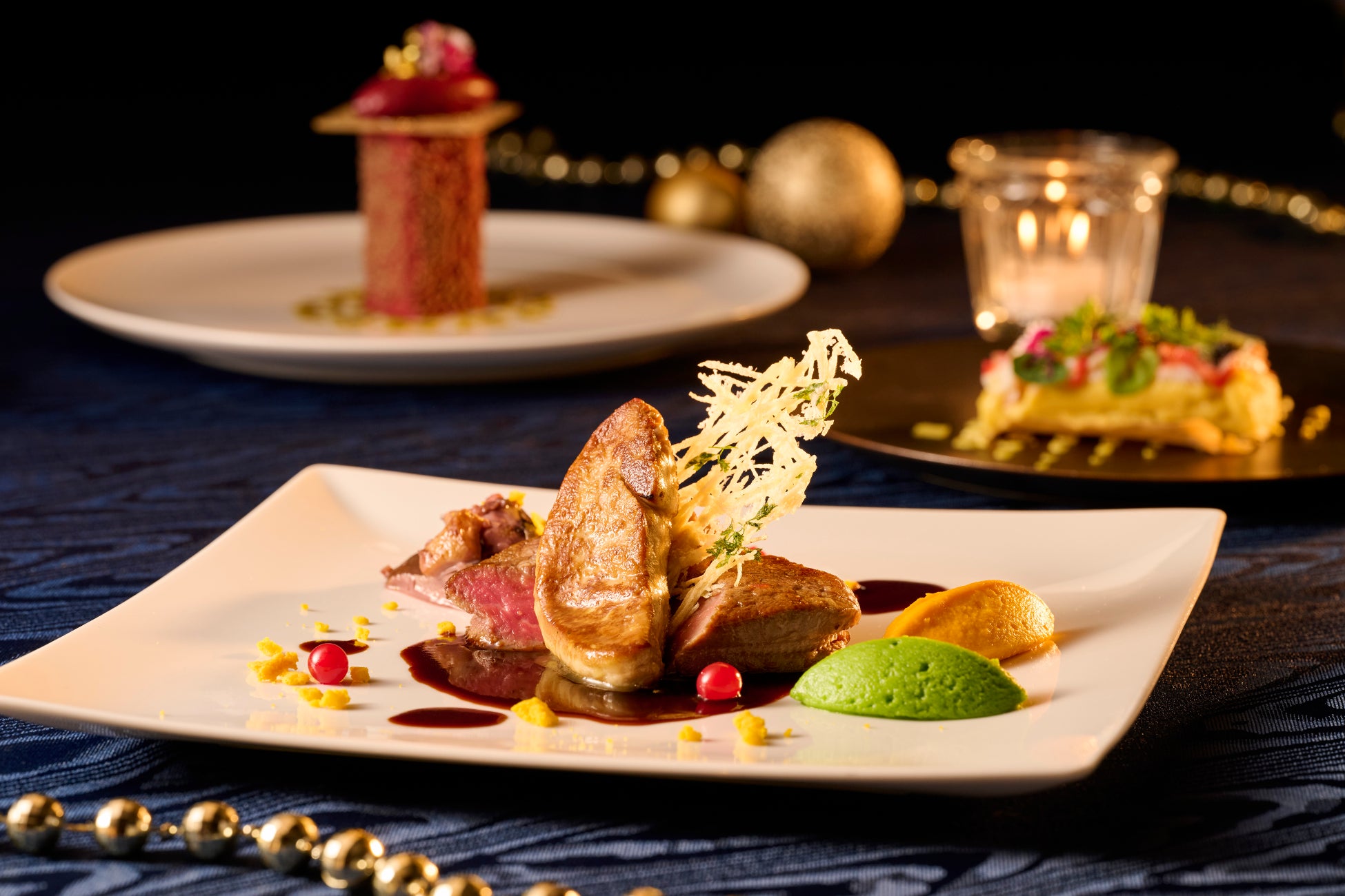 8Fフレンチレストラン「ポム・ダダン」では、一皿一皿の彩りにも心躍る、特別な日にぴったりなディナーコースをご提供いたします。クリスマスディナーをお楽しみいただく2日間は、生演奏で奏でる音楽が聖夜のひとときをより華やかに盛り上げます。また、ローズをあしらったホリデーシーズンだけのスペシャルカクテルもぜひお楽しみください。