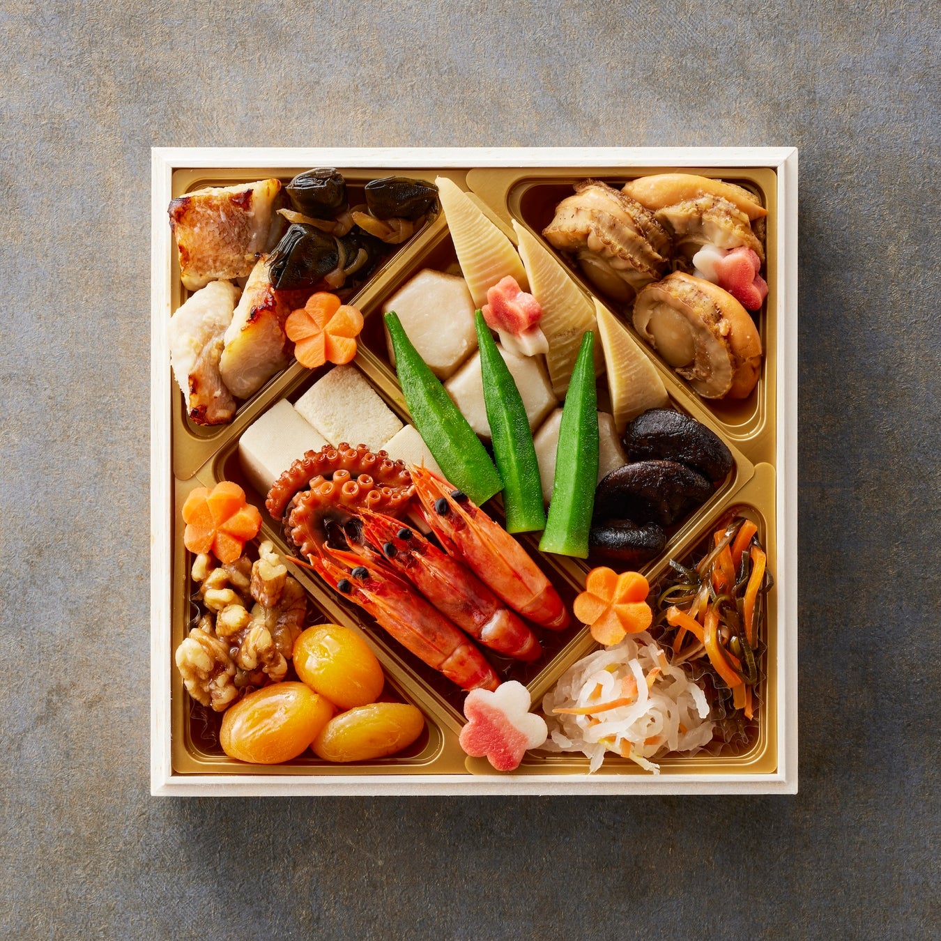 <参の重>赤魚西京焼 、海老芝煮、蛸桜煮、煮帆立、松前漬け、高野豆富、紅白なます、杏蜜煮、胡桃飴煮、昆布巻、梅花人参、梅麩、穂付筍、六方芋、春子椎茸、おくら