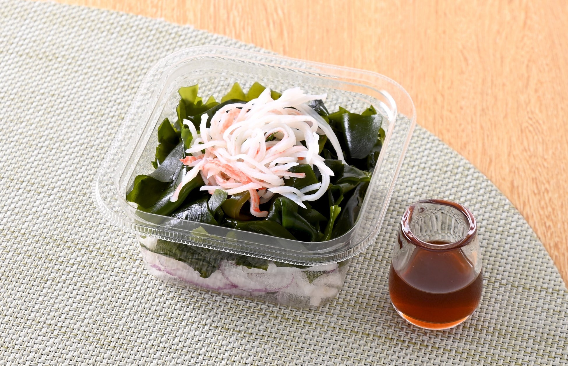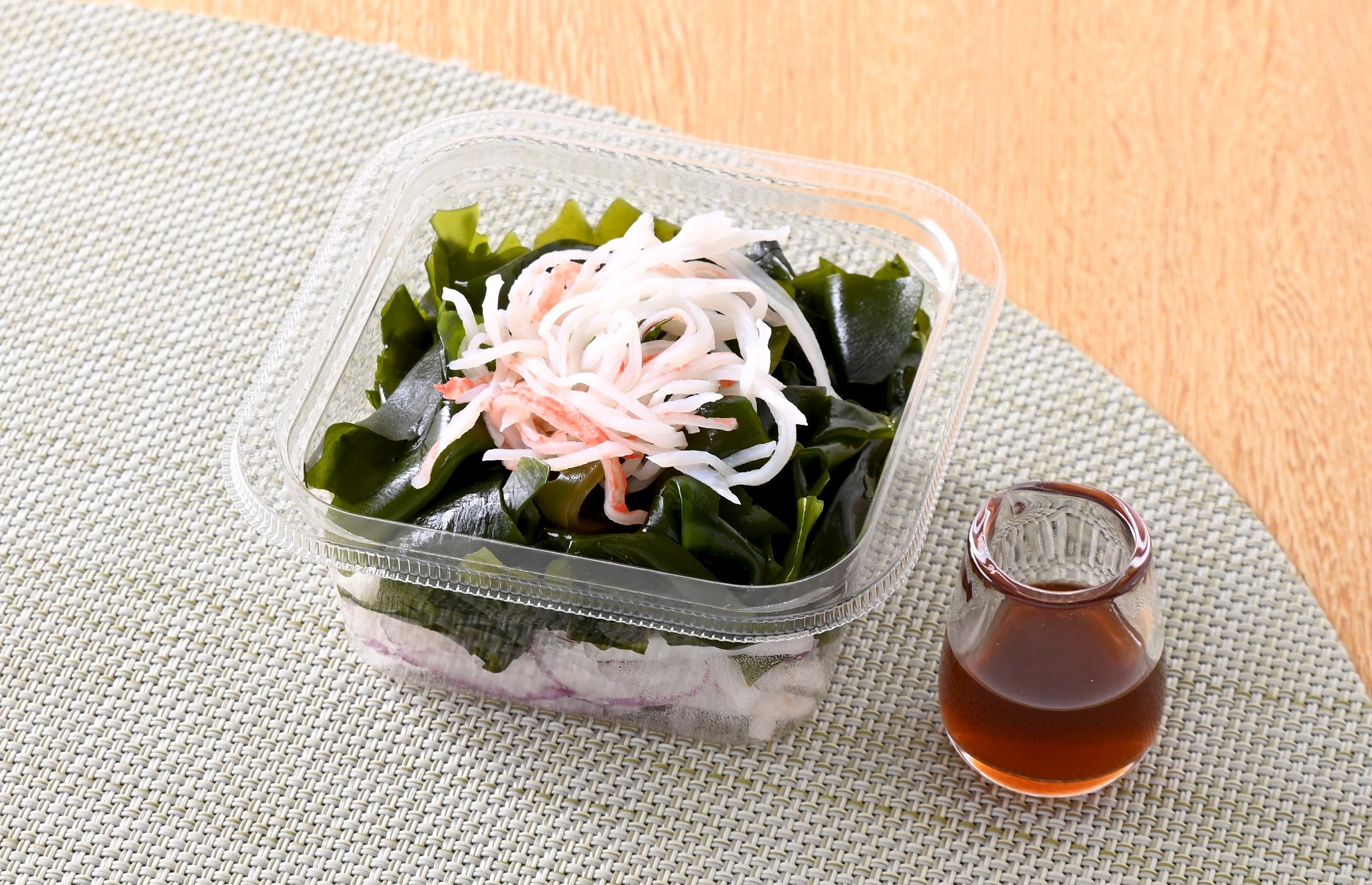 【内容】三陸産わかめにカニカマをトッピングしたサラダです。柚子ポン酢付。