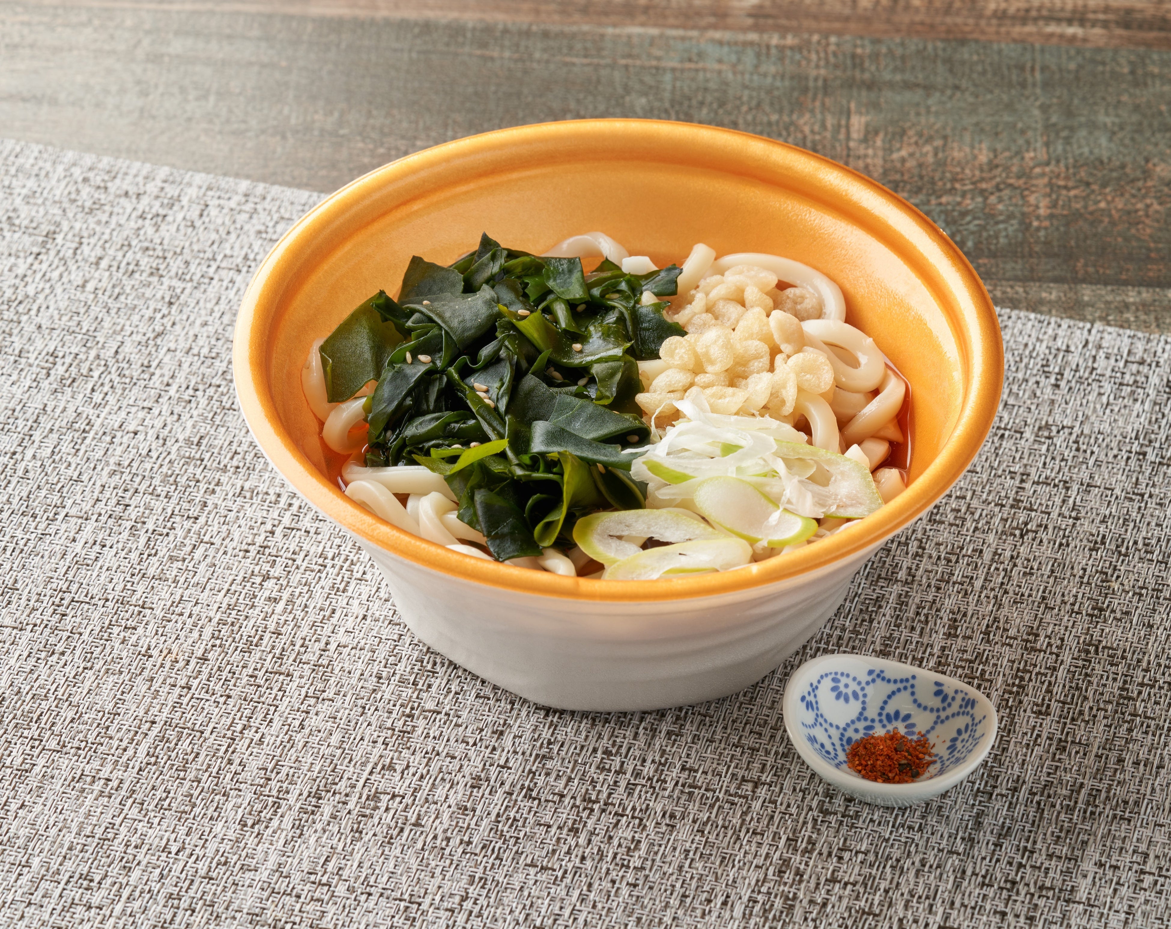 【内容】三陸産わかめと揚げ玉、長ねぎをのせた温かいうどんです。