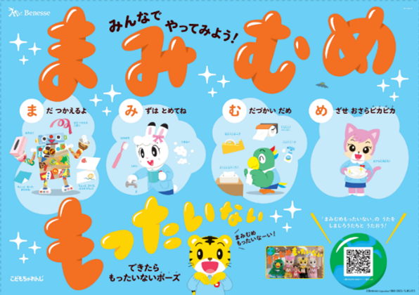 このような声を受け「こどもちゃれんじ」は「子どもたちが『物を大切にすること』への理解を深めて行動につなげられるための学習の支援をしたい」という想いから、「まみむめもったいない」キャンペーンの実施を決定いたしました。「まみむめもったいない」には、「まだつかえるよ」「みずはとめてね」「むだづかいダメ」「めざせお皿ピカピカ」「もったいない!」のメッセージを込めています。日常生活の中で自然と意識してもらえるようになることを目指しています。