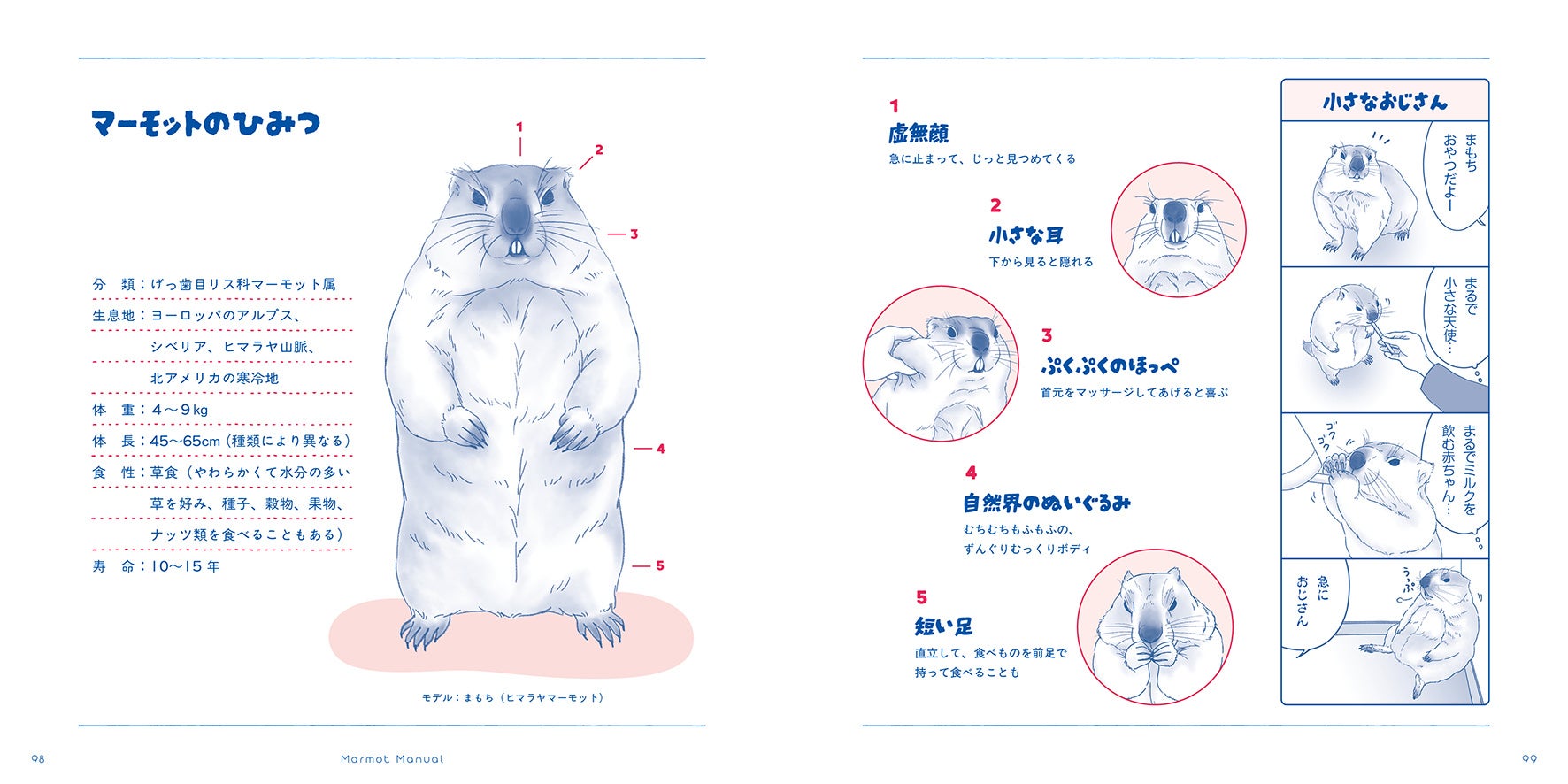 マーモットの特徴や生態、種類、飼育方法をかわいいイラストで紹介。著者の中国マーモット村旅行記も掲載しています。