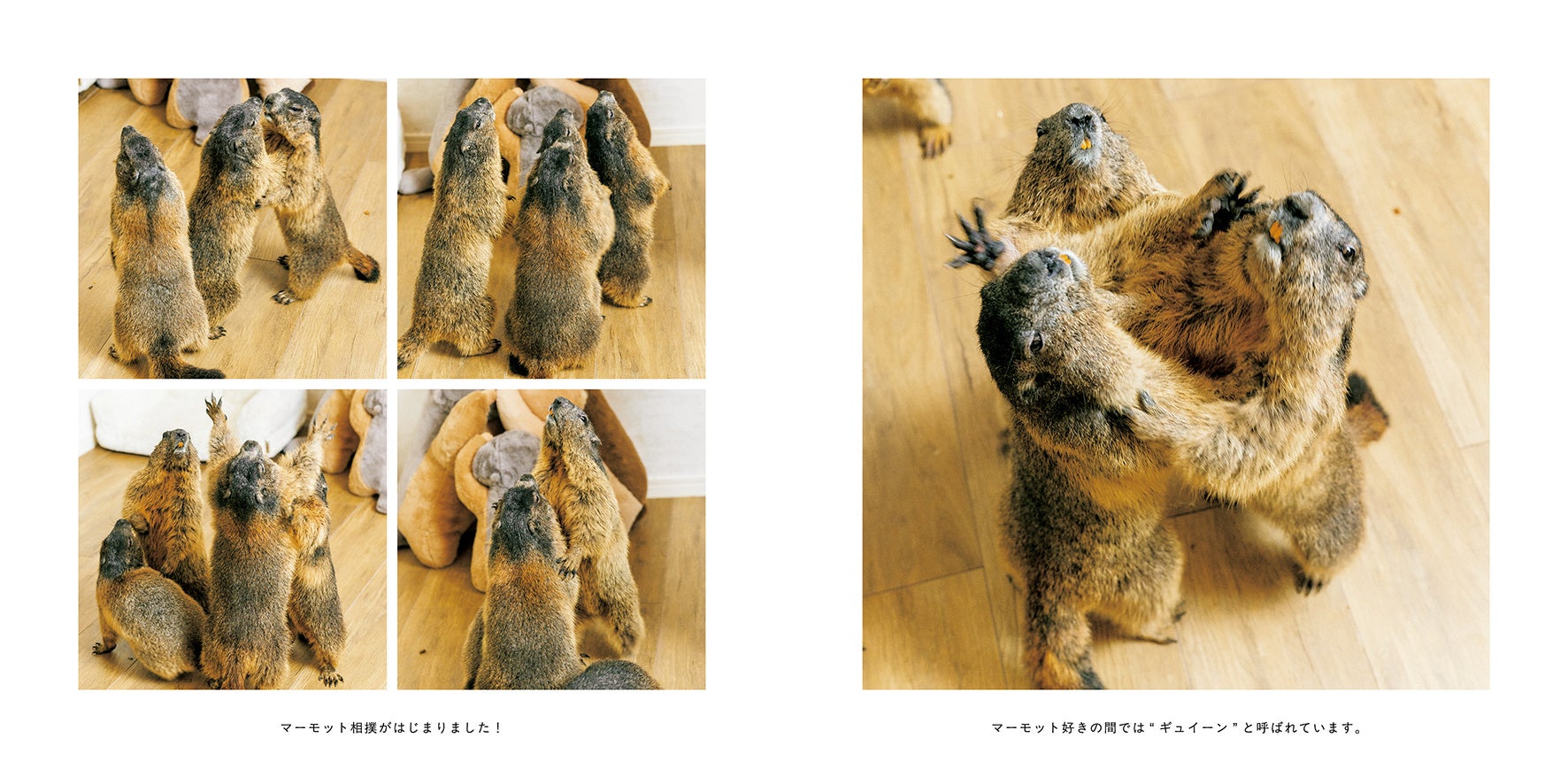 まもち、おもち、プクの日常を写真日記風に紹介。出会いの場面や、おもちとプクの“マーモット相撲“、すみっこの取り合いなど、仲の良い姿が楽しめます。