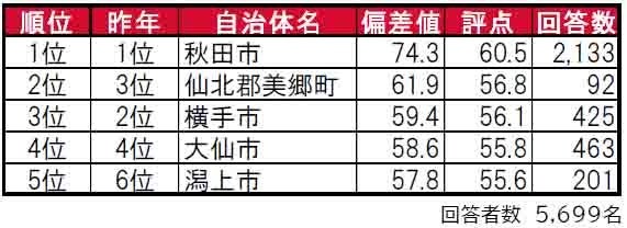 住みここち1位は5年連続で秋田市。2位は仙北郡美郷町、3位は横手市。