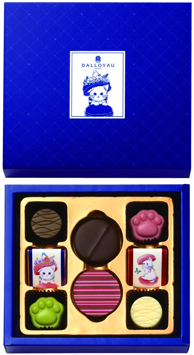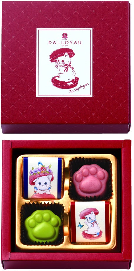 【内容】ダロワイヨの人気キャラクター「ジョセフィーニャ」をデザインしたギフトです。肉球型のチョコレートとジョセフィーニャのラベルデザインチョコ、華やかなディスクチョコなどを詰め合わせました。