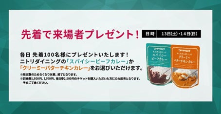 各日 先着100名様にプレゼントいたします!ニトリダイニングの「スパイシービーフカレー」か「クリーミーバターチキンカレー」をお選びいただけます。