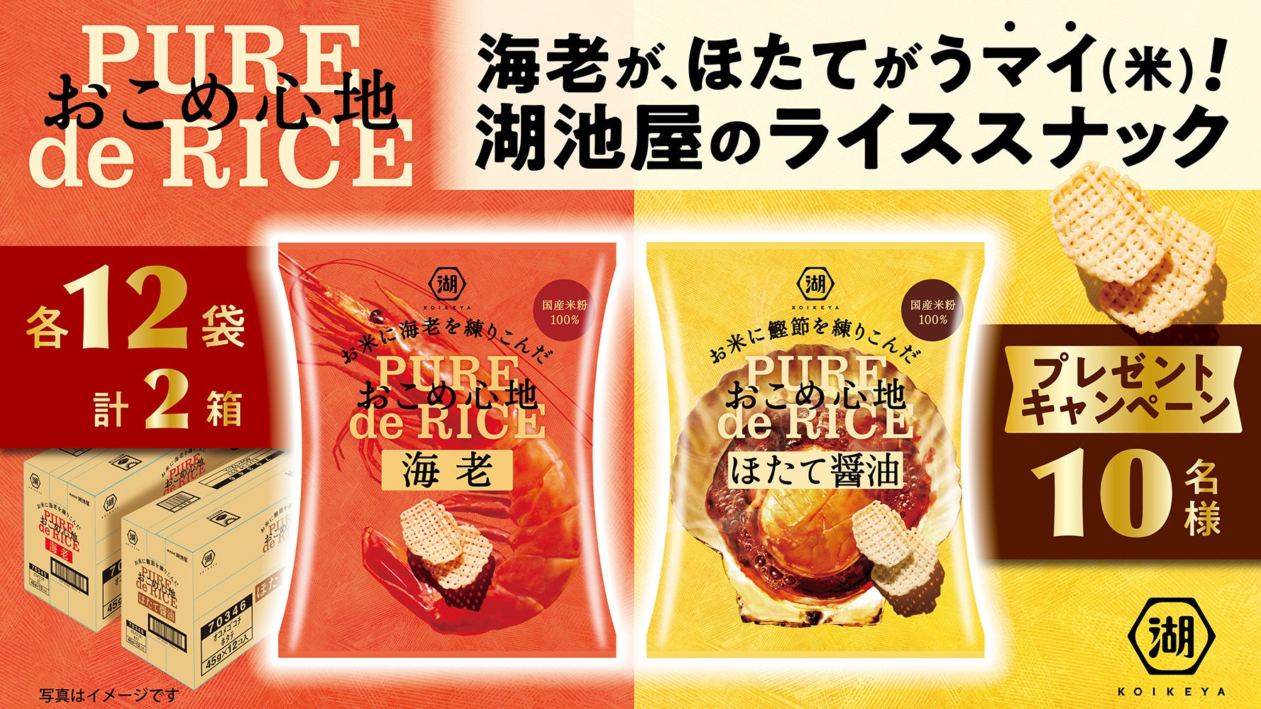 本物素材が練り込まれた湖池屋のライススナック「おこめ心地」のリニューアル発売を記念して、「おこめ心地 海老」「おこめ心地 ほたて醤油」の2品をセットにして、抽選で10名様にプレゼントするキャンペーンを実施します。ぜひこの機会にご応募ください。