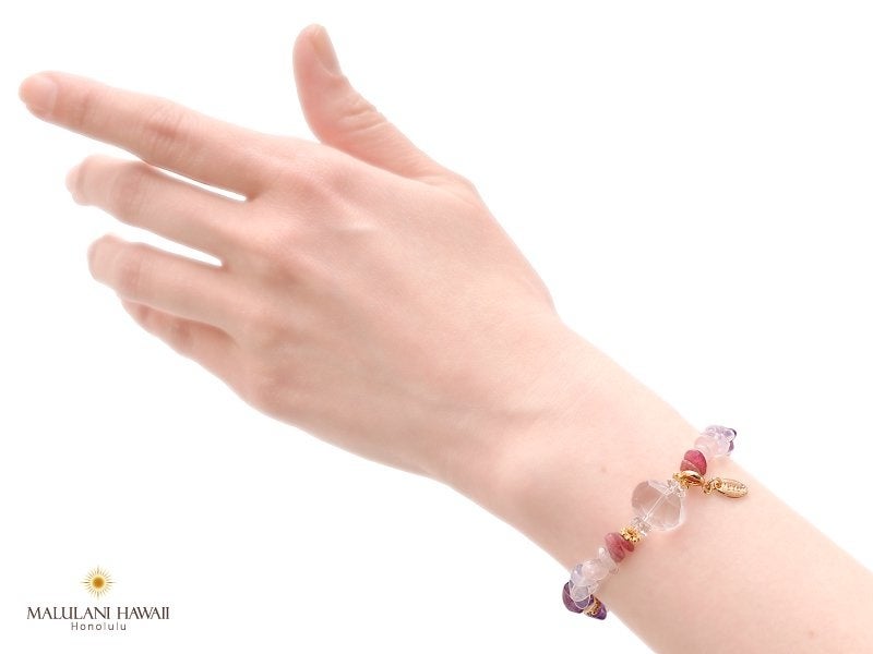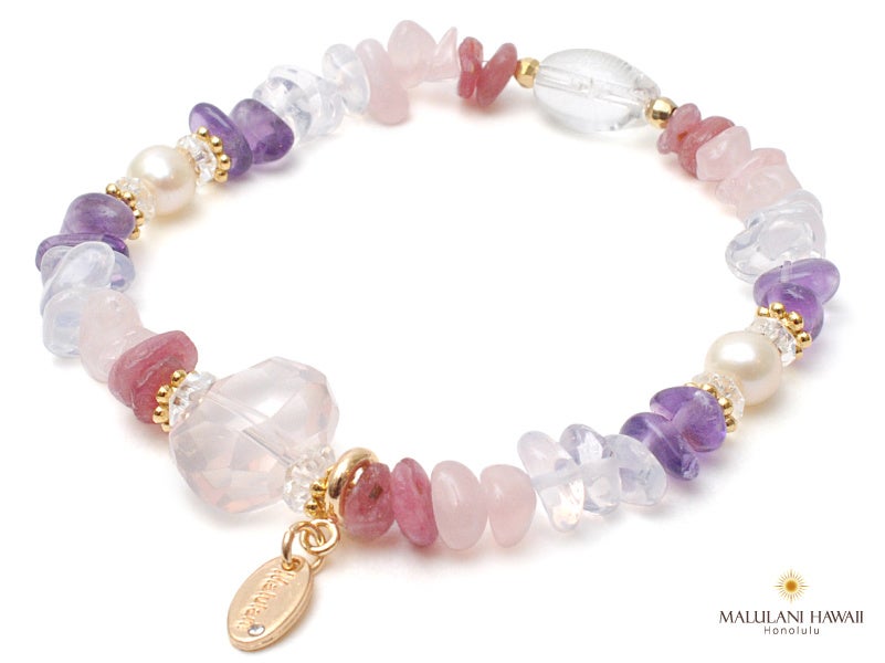 水晶とオリジナルチャームには、ハワイ語で「神のご加護」を意味する「Malulani」と刻印。