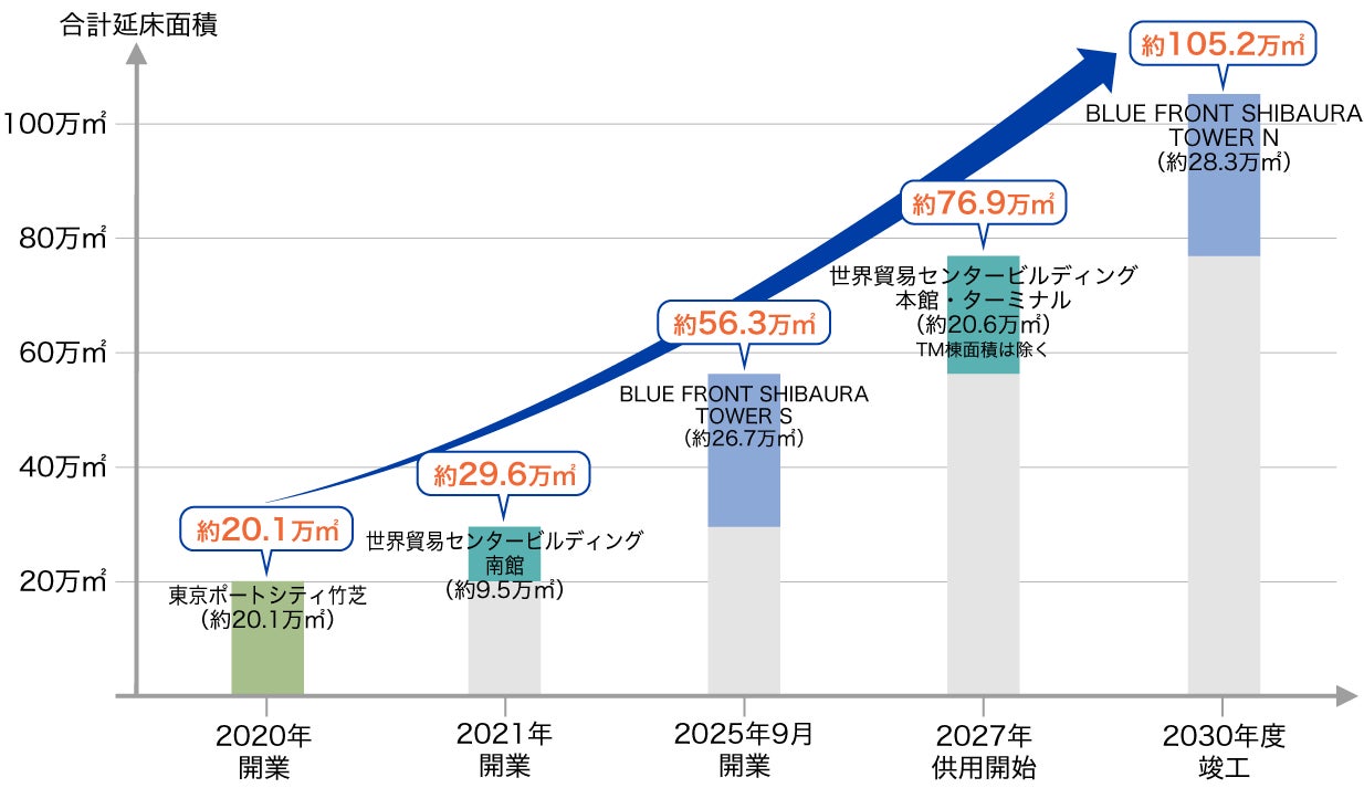 浜松町ビルディング(東芝ビルディング:東京都港区芝浦 1-1-1)の建替事業として、高さ約230mのツインタワーから成る大規模複合開発。(TOWER S:2025年2月竣工済、TOWER N:2030年度竣工予定)。区域面積約4.7ha、延床面積55万㎡のオフィス・ホテル・商業店舗・住宅等で構成される建物で、事業期間は約10年間に及ぶ。