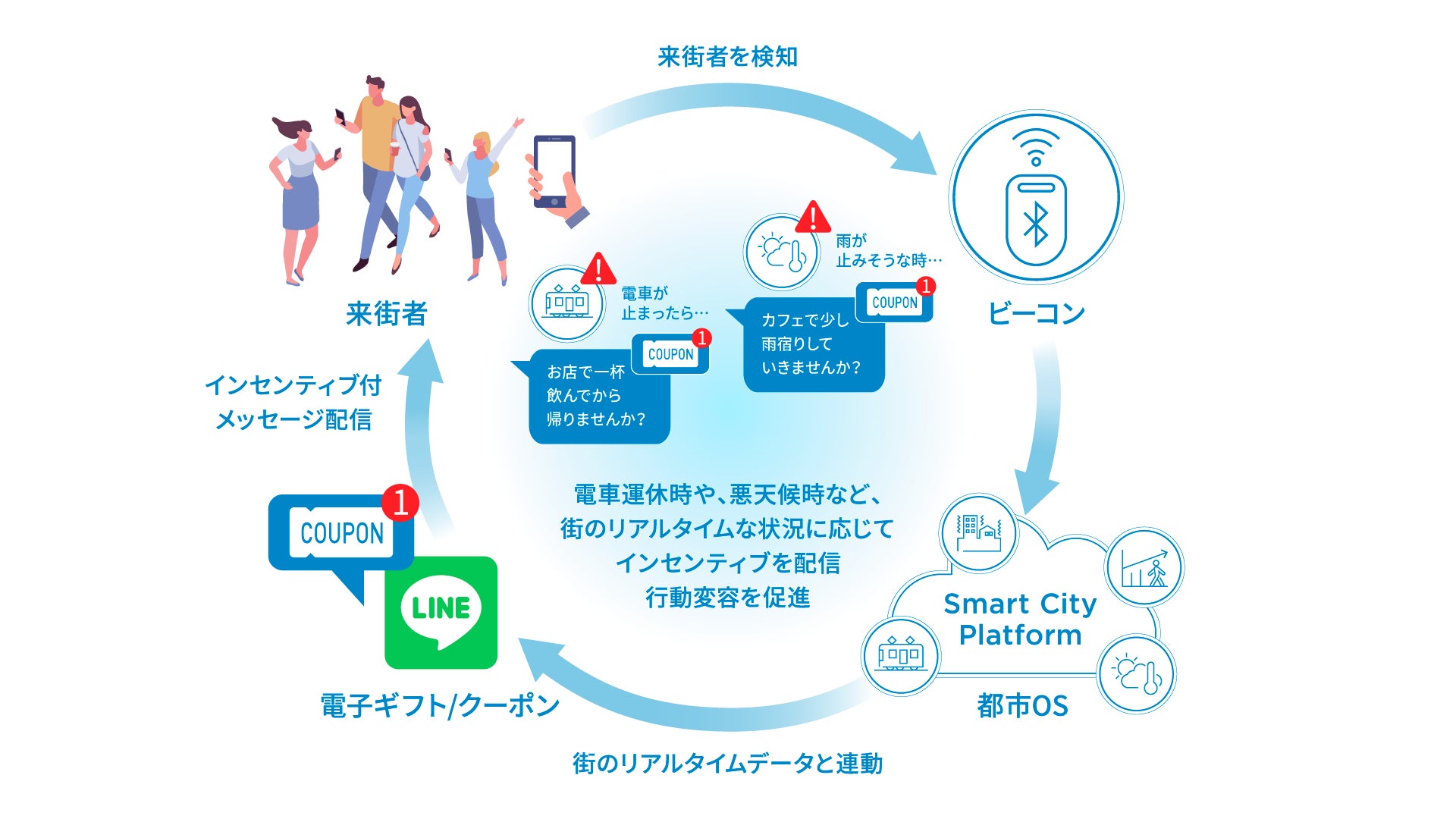 また、竹芝地区において実装している、天候や交通情報といったまちのリアルタイムデータに基づき、店舗等で利用できる電子クーポンを配信するリアルタイムインセンティブ配信システムを、同LINEにも導入します。顧客接点である同LINEを通じて、属性・行動データを取得し、リアルタイムデータと連動したサービスにより、顧客の行動変容や回遊性向上を図って参ります。
