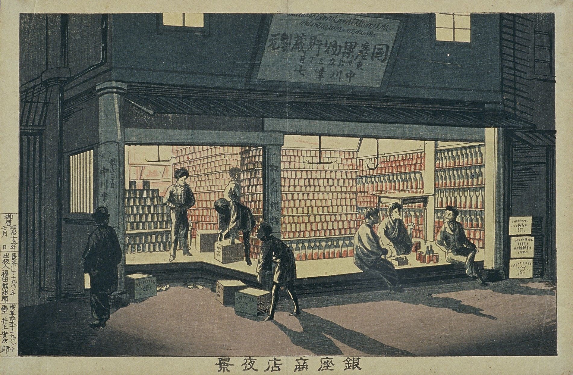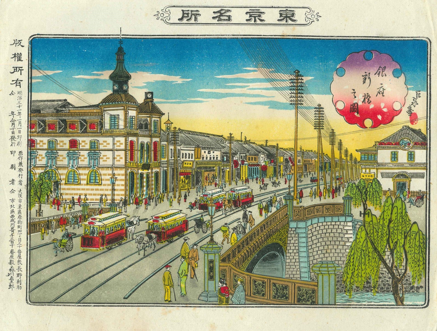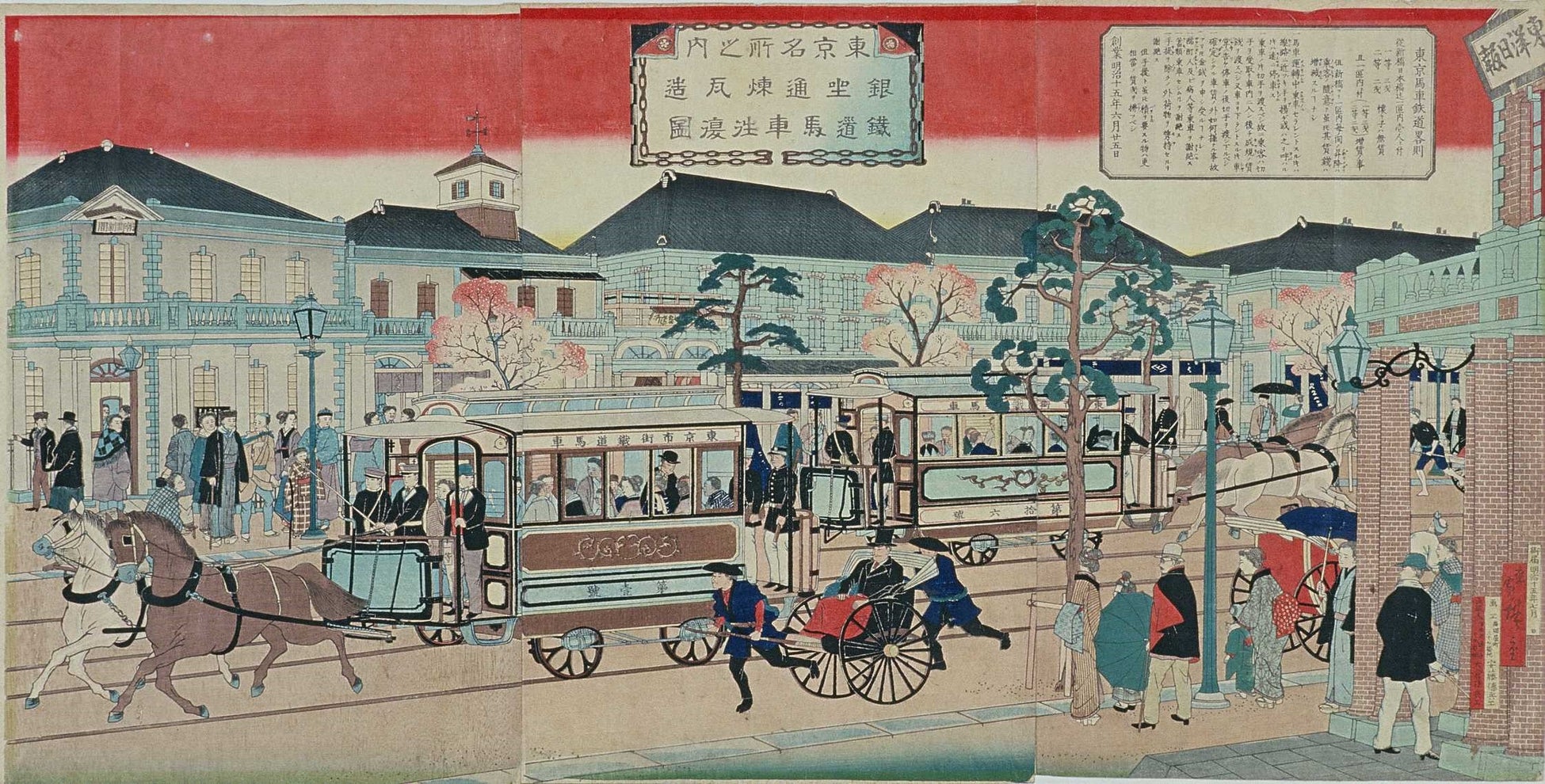 この西洋風の都市風景は、工事が進むにつれて計画が見直され、明治10年(1877)には街全体が完成しました。当初は払い下げ価格が高く、空きスペースも多く見られましたが、やがて新聞各社の建物や時計、輸入品を扱う商店、開化文物を製造販売する店舗が次々と並び、銀座は情報や文化の発信地として、文明開化のショーウィンドウとなりました。関東大震災や戦争の被害を乗り越えた銀座は、現在でも日本を代表する繁華街として、国内外の多くの人々を魅了し続けています。