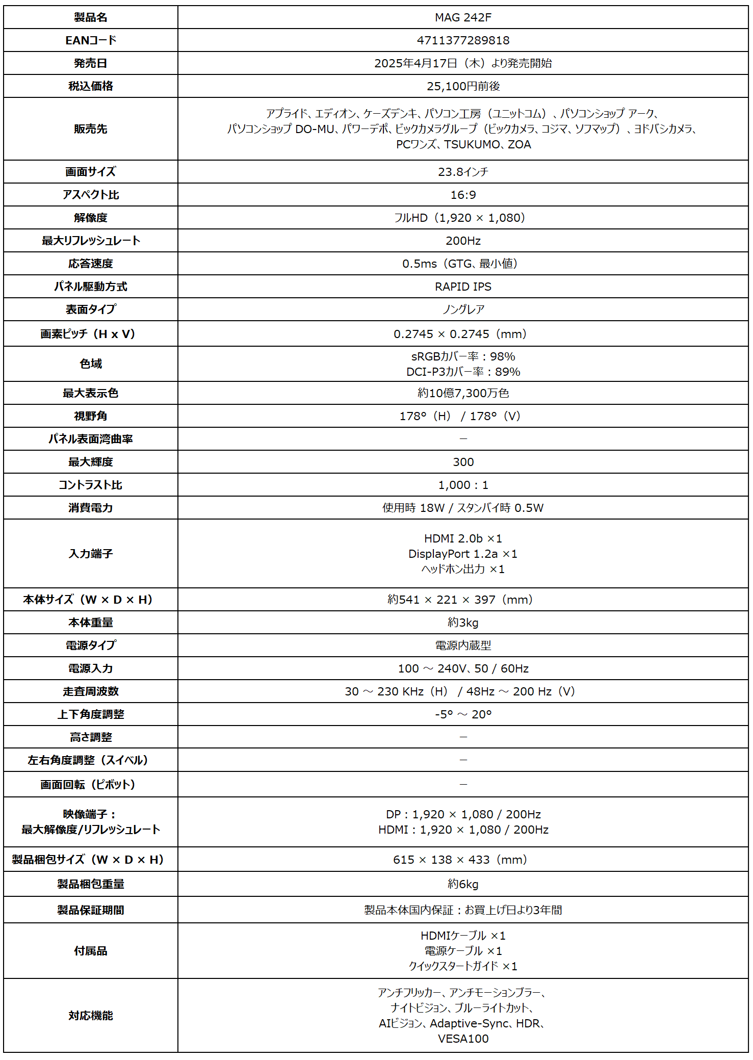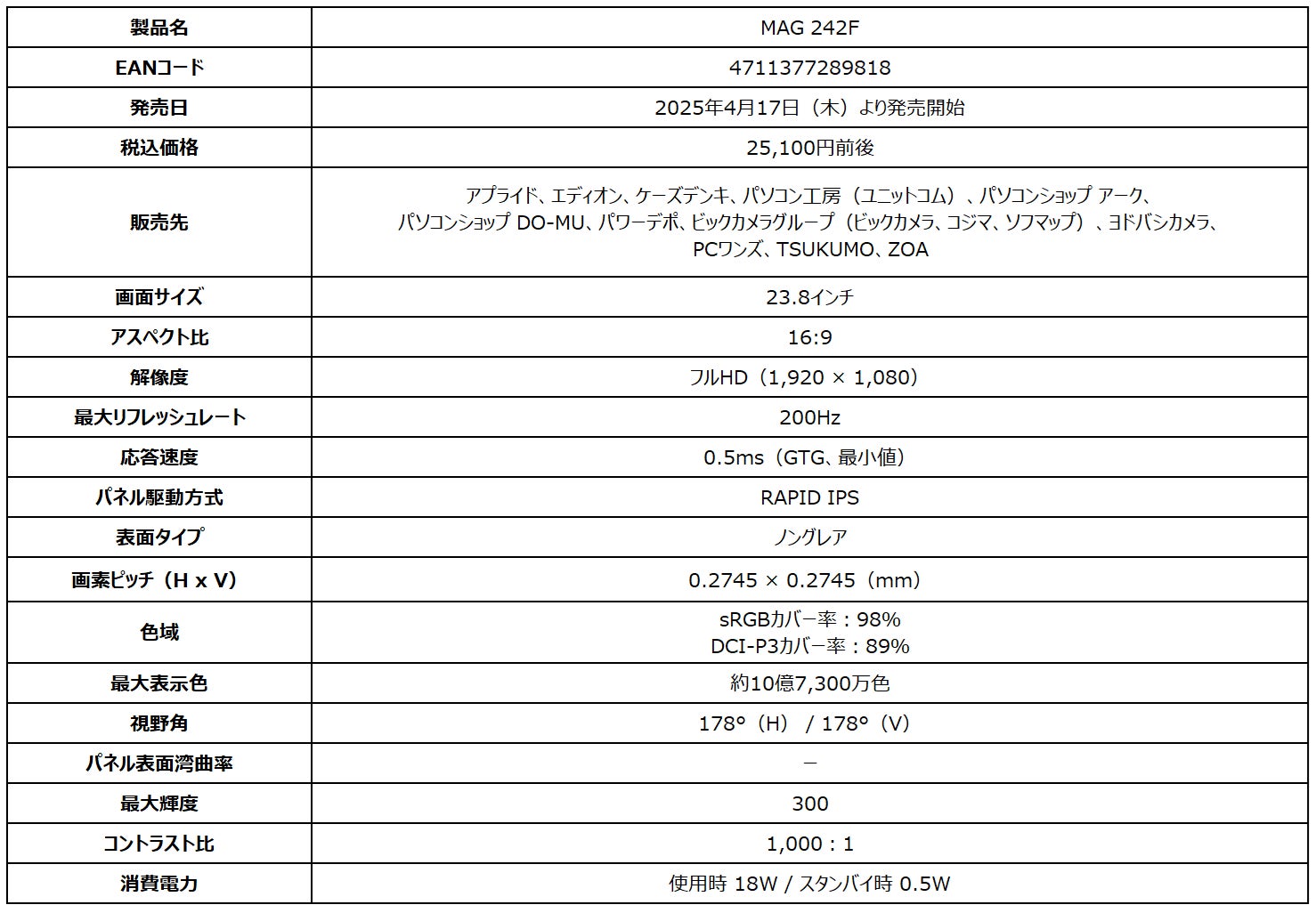 この度、エムエスアイコンピュータージャパン株式会社は2025年4月17日(木)より、ゲーミングモニターの新モデルを発売いたします。高いゲーミング性能を誇る『MAG』シリーズから、手頃なサイズ感の23.8インチ、RAPID IPSパネル、フルHD(1,920 × 1,080)解像度、リフレッシュレート200Hz、応答速度0.5ms(GTG、最小値)の「MAG 242F」が、新たにラインナップに加わります。