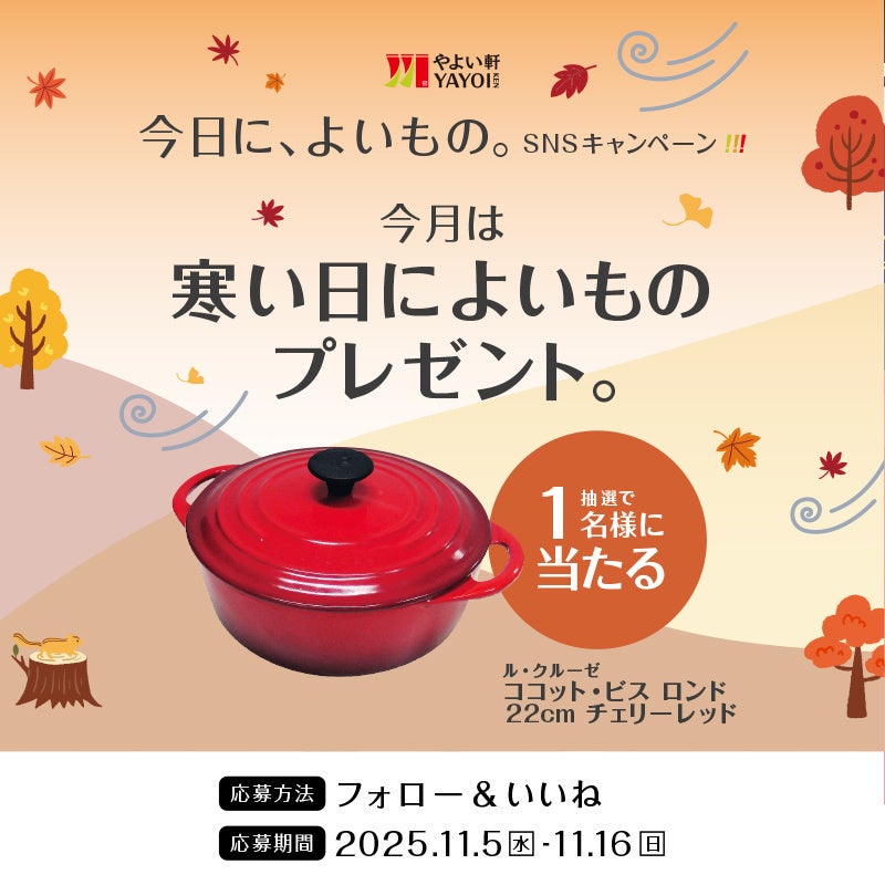 このたび日本国内の「やよい軒」では、やよい軒公式X・公式Instagramにおいて、3月より毎月『今日に、よいもの。』キャンペーンを実施しております。11月は11月5日(水)から新発売する「すき焼き定食」の発売を記念して『寒い日に、よいもの。』をプレゼント!毎月催事に合わせたプレゼントをご用意しておりますので、ぜひ、この機会にキャンペーンにご参加ください。
