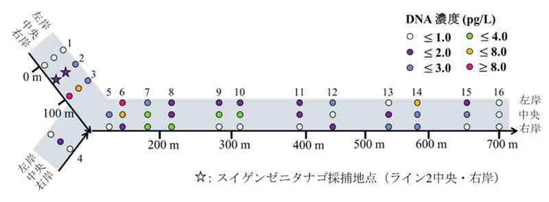 - 河川や農業水路の環境水中には、生息している生物から糞や粘液などが排出されますが、それらの中にはその生物に由来する環境DNAが含まれています。本研究では、環境DNA分析によってスイゲンゼニタナゴの生息の有無を推定できる新たな調査手法の開発に初めて成功しました。