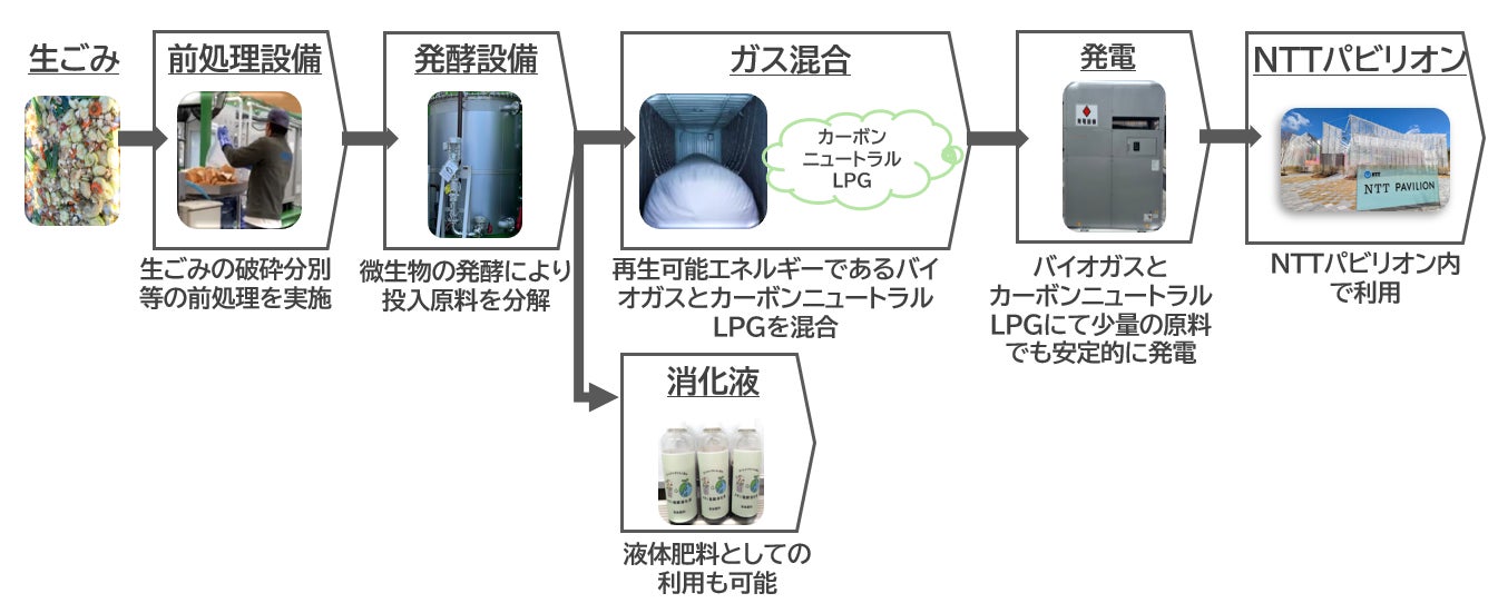 これにより、生ごみ廃棄(焼却・運搬)に掛かるCO2を削減するとともに、再生可能エネルギーを創出し、一部電力をNTTパビリオンに供給することで、資源循環の実現に取り組みます。