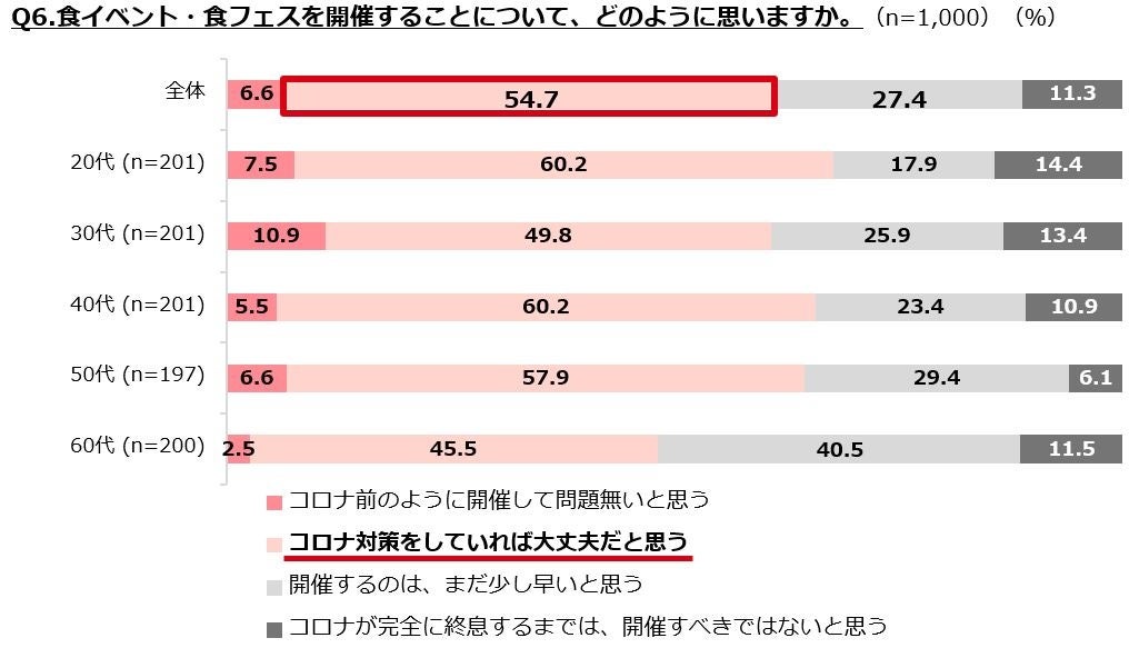 ・イベントの開催については、「対策をしていれば大丈夫」が55%、「まだ少し早い」が27%で、「まだ少し早い」は年代が上がるほど増加傾向。