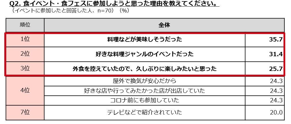・参加理由は「料理などが美味しそうだった」、「好きな料理ジャンルのイベントだった」、「外食を控えていたので、久しぶりに楽しみたいと思った」がTOP3。