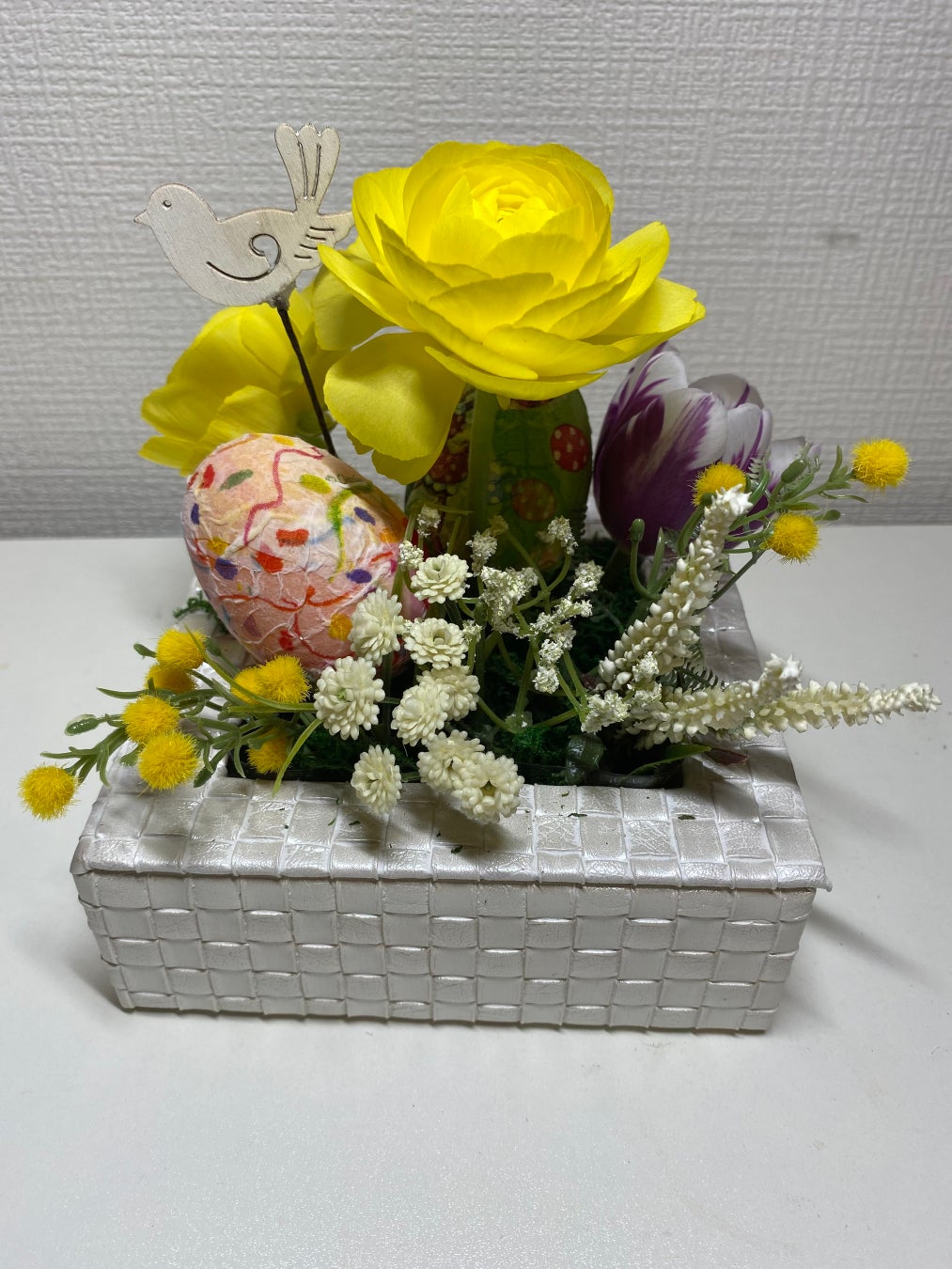 イースターのたまごをつくって、長く飾れるアーティフィシャルフラワーと生花を使用したアレンジをします。
