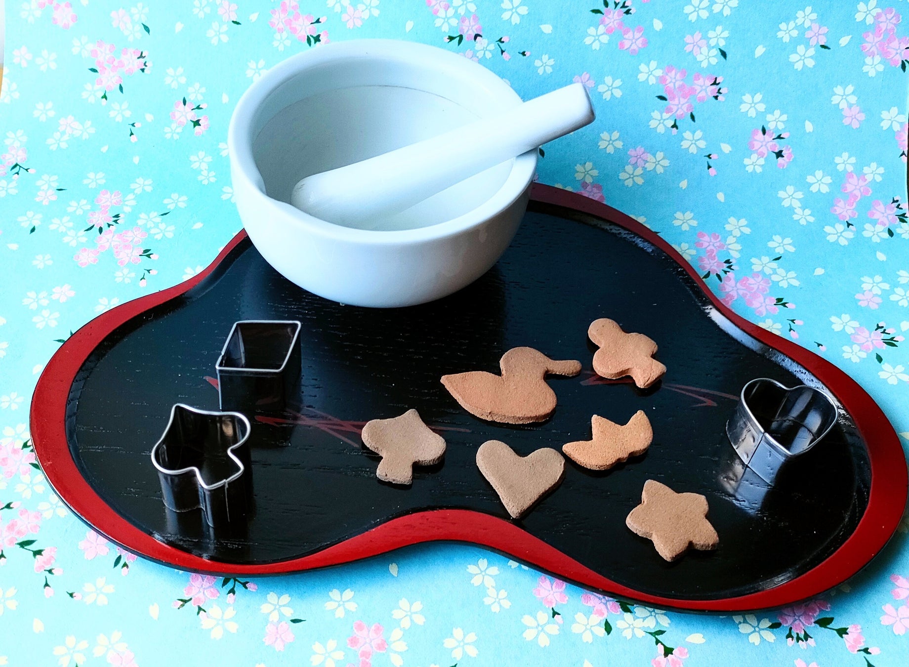 天然香料を練り合わせ、クッキー型で抜いて、見た目も可愛い、優しい香りのお線香をつくります。※15個程度、自宅で焚ける香灰付き