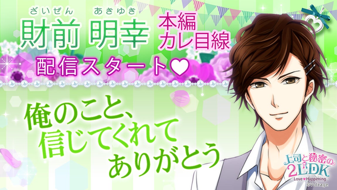 株式会社ボルテージ(本社:東京都渋谷区 代表取締役:津谷 祐司)は、提供中のボル恋タイトル「上司と秘密の2LDK Love Happening 」にて、財前明幸の本編カレ目線ストーリーを9月18日(日)より配信開始したことをお知らせいたします。